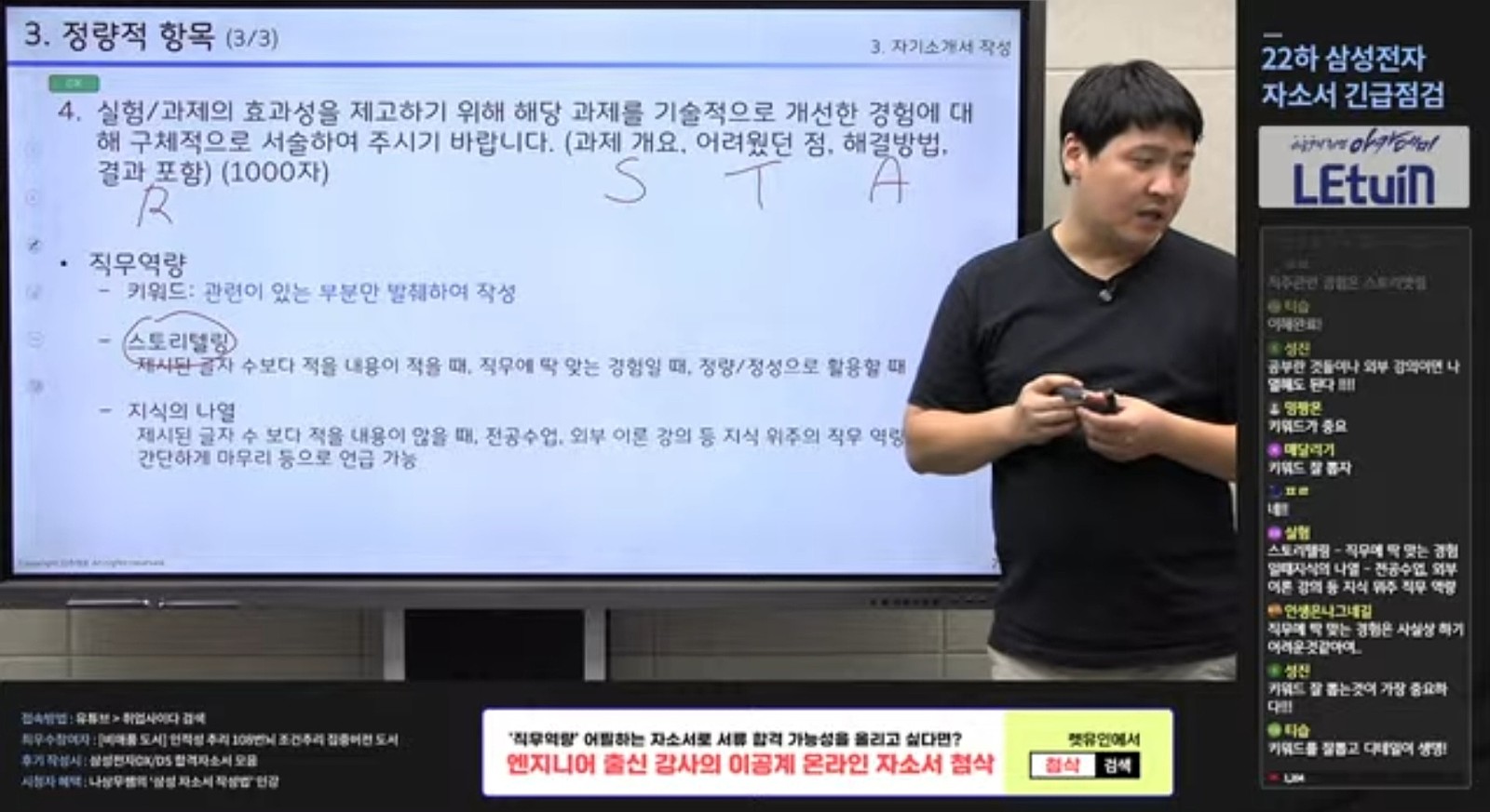 [생방송 특강 수업내용] 이력서와 자소서의 일관성은 면접 합격을 위함 <자기소개서 작성 순서> 1. 산업/회사/직무 타겟팅 2. 경험을 정리하고 보유 역량을 정리하며 사전 준비 3. 항목을 읽고 어떤 항목에 어떤 소재와 역량을 배치할지 의사결정 4. 주된 메세지 및 문단 흐름 확정 5. 문단 흐름에 맞취 작성, 글자 수는 +-100~200자 6. 퇴고하며 문맥 조정 및 수식어 삭제 등을 통한 글자 수 조정 <정량> 잠재, 간접, 직접을 나누어보자 Ex) 전자과/ 관련실습 해봤다/ 어떻게 직무에 적용할 것인가 job description을 꼭 활용하자. 나의 역량을 셋팅. 비슷한 것이 있으면 어필! AI 대비로 키워드를 강조하여 말하기 포토공정으로 좁혔는데 면접에서 설명을 못한다면 도루묵. <정성> 일에 대한 태도, 조직에 임하는 자세, 위기 대응 등 Ex)동아리, 연수사항(직무와 연관된 사항), 블로그&커뮤니티, 대내외 활동, 아르바이트 등 [수강 후기] 경험과 역량을 구분하는 방법을 알게 되었고, 정석적 역량과 정량적 역량 중 무엇을 어필해야 할지 기준을 잡을 수 있었다. 자기소개서 항목을 분석해 주시면서 에세이를 어떤 식으로 써야하고, 풀어야 할지 알 수 있어서 좋았습니다. ※ 본 게시글은 2022.09.06 진행된 주영훈 선생님의 2022년 하반기 대비 삼성전자 자소서 긴급점검 특강에 대하여 렛유인 카페에 남겨주신 생방송 특강 시청 후기입니다.