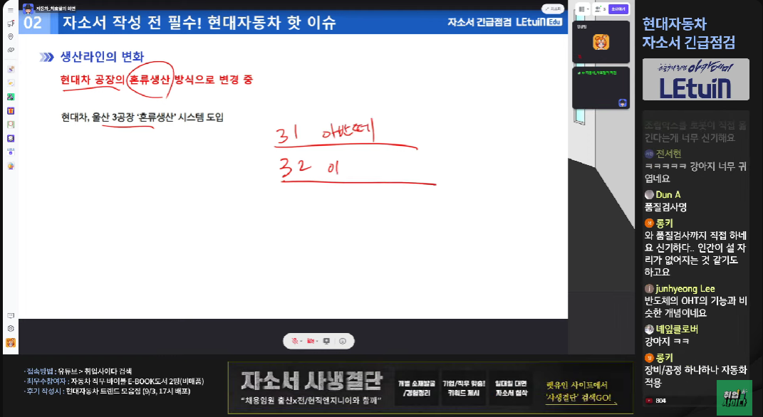 하지만 영상을 보면서 자소서뿐만 아니라 자동차 산업 전반과 트랜드에 대해 쉽게 이해할 수 있는 유익한 시간이었습니다. 생방송 시청 인증 이미지