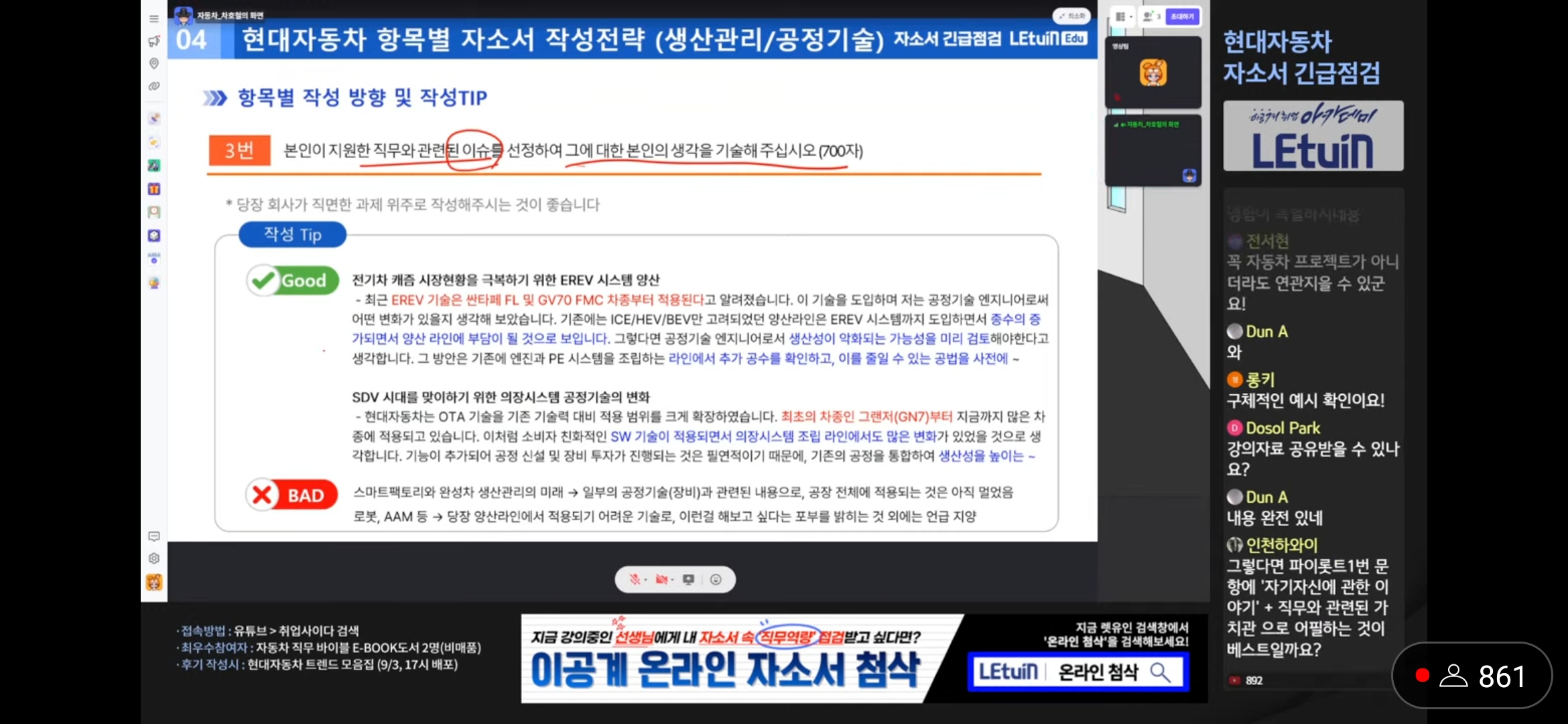 현대자동차의 전동화, 자율주행 등분야 에 대해 설명을 받을 수 있어서 좋았고 자소서 작성할 때 많이 도움이 될 것 같습니다. 1차면접 준비를 위해서는 자동차의 산업과 구조에 대해 어려워도 공부를 꼭 해야 한다는 말씀 잘 새겨 듣겠습니다.