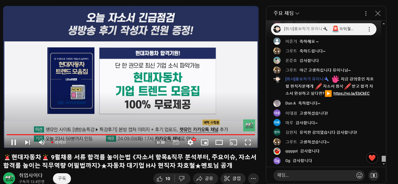 오늘 특강을 통해 직무 분석방법이나 자소서 작성 팁, 사례를 들어가며 설명해주셔서 매우 유익했던 것 같습니다. 생방송 시청 인증 이미지
