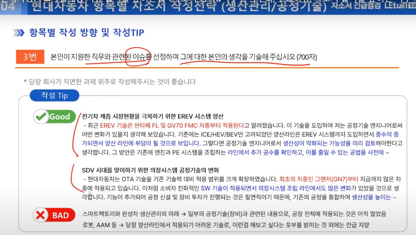 현대자동차 핫 이슈 EX) 2차전지 생산 관련 규제로 인한 전기차 성장 시장 둔화 자기소개서 작성 팁 EX) 현업 용어, 현직 관련 이슈, 채용 공고 활용법 3. 수강후기