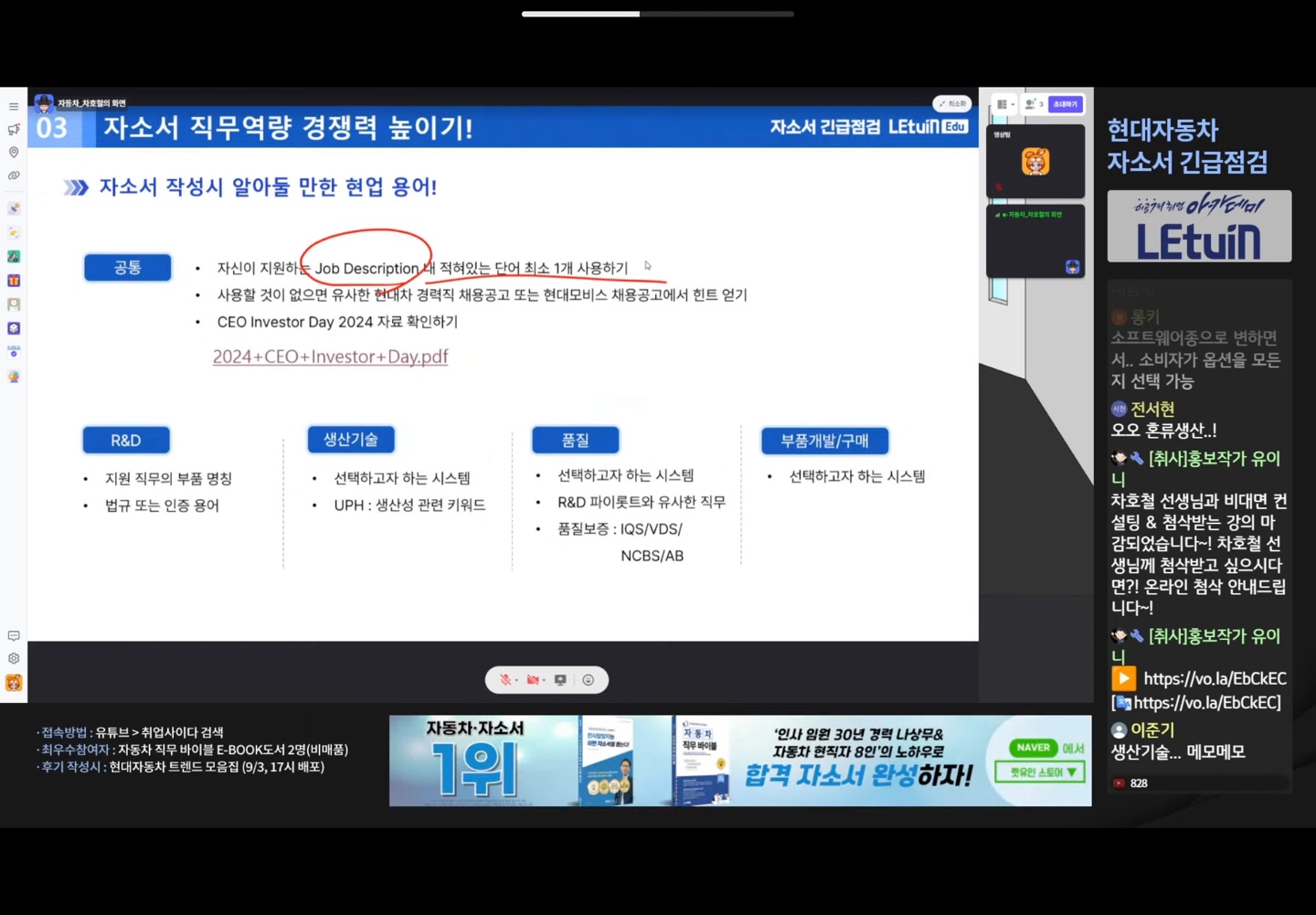 현재 현대자동차 핫 이슈 : 각 분야별 이슈들이 본인이 해당하는 직무에 어떻게 적용될 수 있는 지 생각 자소서 작성 전략 : CEO Investor day 확인, 경력직 채용공고를 통해 원하는 직무의 디테일 챙기기 자소서 항목 분석 : 본인의 논리적인 생각 구조 필요 3. 수강후기