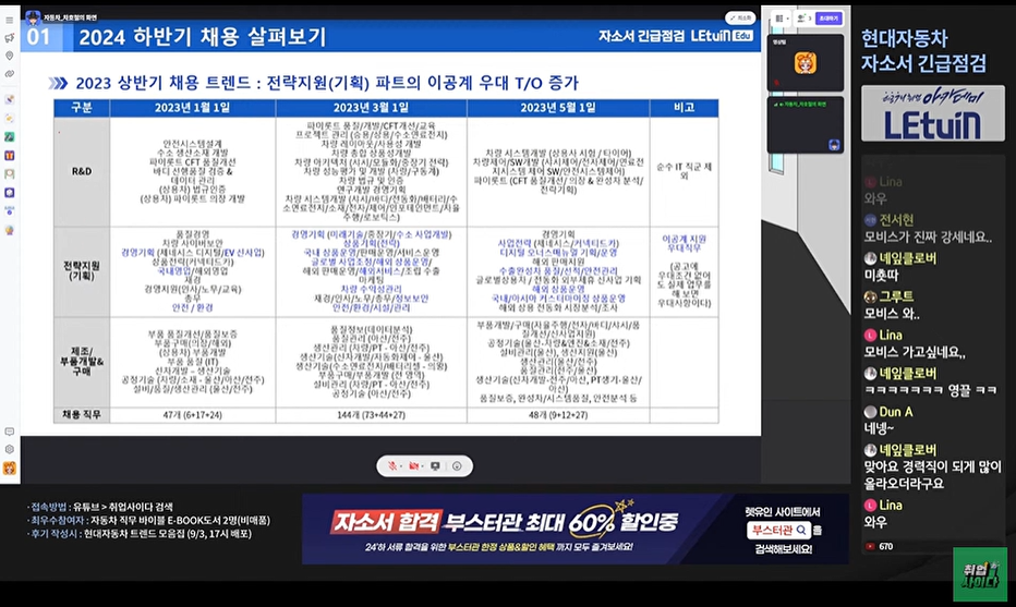9월 2일에 진행한 2024 하반기 자소서 긴급점검_현대자동차 특강이 정말로 도움이 되었습니다. 제일 먼저 올해 하반기의 채용을 현대차, 기아차, 현대모비스 각각의 차이점을 알려주셔서 좋았습니다.