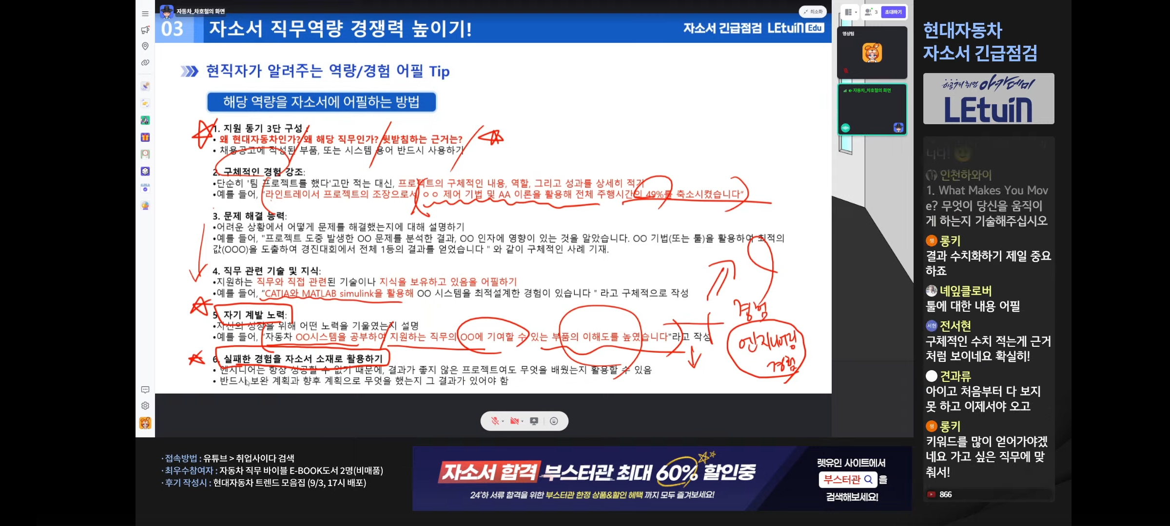 2. 자동차 개발 프로세스와 각 프로세스에서 담당하는 직무가 무엇인지 배웠습니다. 3. 채용공고 분석법 및 자소서 작성 꿀팁을 배웠습니다. 3. 수강후기