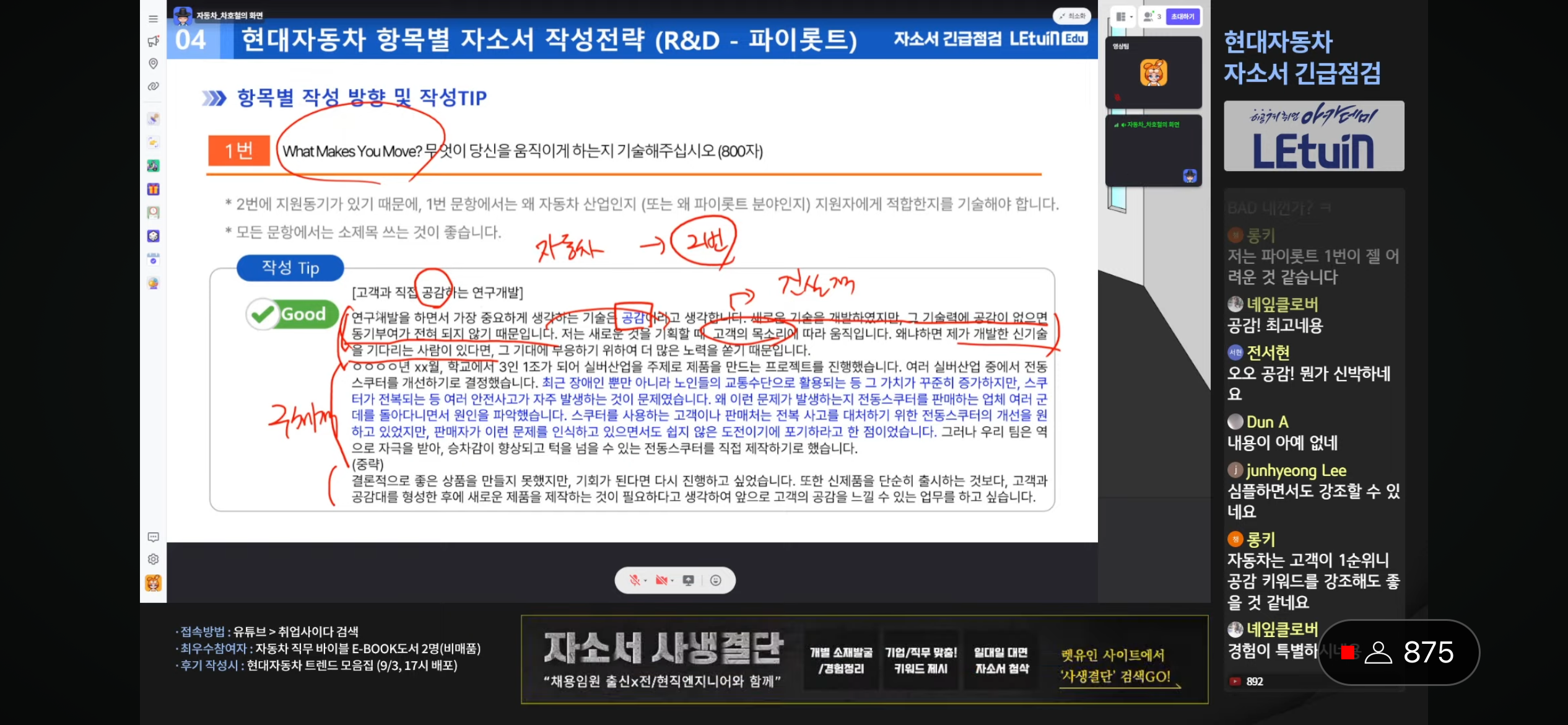 전체적으로 방향을 잡아준 강의였습니다. 내가 뭘 어떻게 준비해서 자소서를 쓰고 면접에 가서 어떤 키워드를 이용해서 면접관님과의 싸움에서 밀리지 않는 싸우는 방법을 알려준 강의였습니다. 너무 과장해서 키워드를 넣는다면 역효과를 낳게 되는 수순을 밟게 되는 미래만 남게 되어 이것을 수정하는 내용을 알려주셨던 강의였습니다.