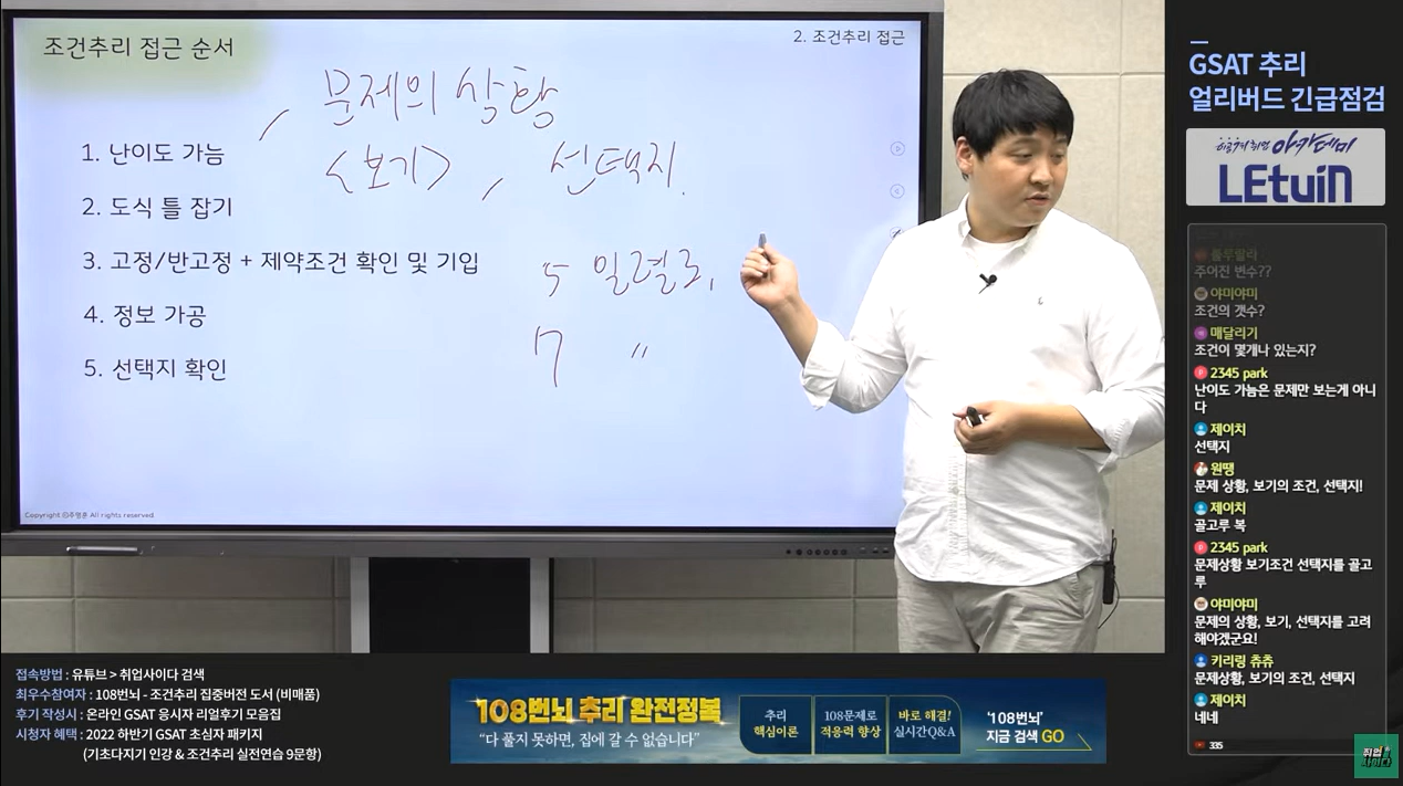 [생방송 특강 수업내용] -추리영역 문제 풀이 순서: 삼단논법->도형추리->도식추리->어휘추리->논리추론->진실게임/조건추리 -조건추리 접근순서 1) 난이도 가늠 2) 도식 틀 잡기 3) 고정/반고정+제약조건 확인 및 기입 4) 정보 가공 5) 선택지 확인
