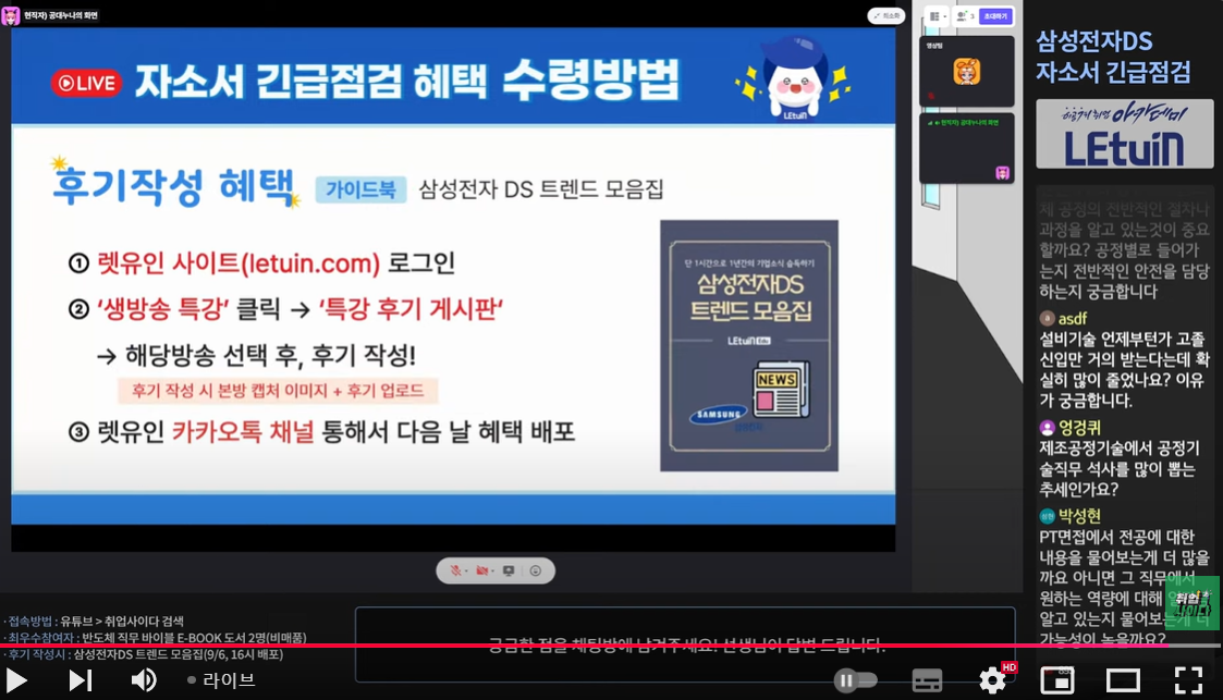 삼성전자DS의 직무가 엄청 많다보니 어떤 직무를 골라야할지 고민이 많았는데, 어떤 이슈가 있고 인력이 어떻게 운영되는지 설명해주셔서 너무 좋았습니다. 자소서 팁도 알려주셔서 잘 써먹을 수 있도록 하겠습니다.