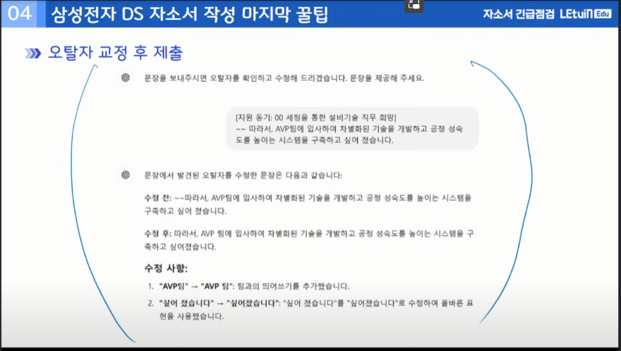 24년 하반기 삼성 직무 바뀐점, 직무별 어필해야할 점, 자소서 문항별 강조해야될 것, 자신의 경험을 어떻게 자소서에 넣어야 할지 등에 강의 하고 사회이슈에 대해 어떻게 조사하고 해야하는지 배울 수 있었다.