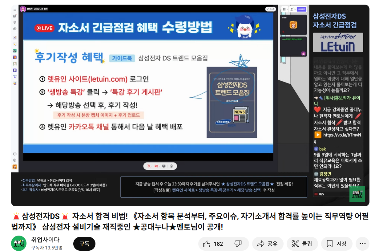 지금까지 놓쳤던 부분들을 캐치할 수 있어서 좋았고, 삼성전자 관련된 이슈들을 한번에 정리해 볼 수 있어서 유익한 시간이었습니다. 그리고 자기소개서 작성 방법도 알게 되어 좋았습니다.