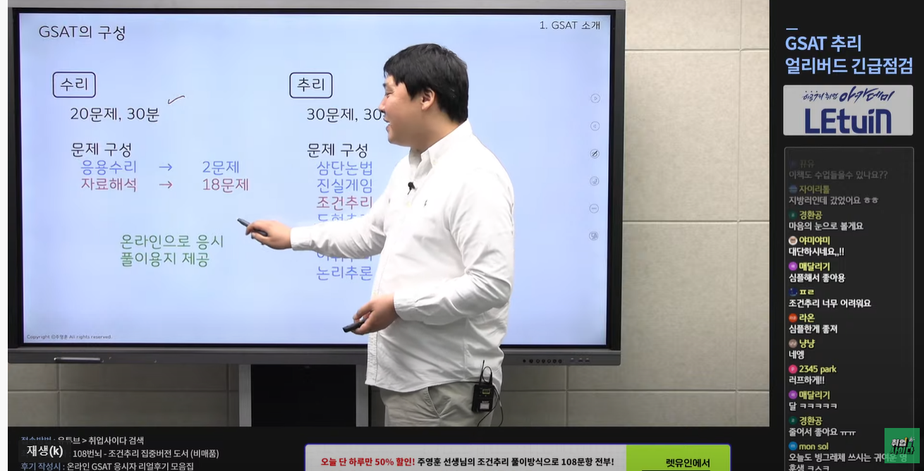[생방송 특강 수업내용] ‧ 조건 추리는 시간이 많이 걸리니깐 제일 마지막에 푼다 ‧ 요즘은 참/거짓 문제가 조건 추리에 많이 섞여서 나오는 편 ‧ 명제, 도식추리 등 빠르게 해결하고 최대한 조건 추리에 많은 시간을 할애한다 ‧ 단시간에 문제를 푼다고 느는 것은 아니다. 다만 시간이 오래 걸리는 유형(자료해석, 조건추리)는 미리미리 공부 해두면 좋음 [수강 후기] 같이 시험을 준비하는 사람들과 긴장감 속에서 문제를 풀 수 있다는게 좋았습니다. 항상 양질의 문제를 렛유인을 통해 많이 보는 것 같은데 이 점이 너무 좋았습니다. 또한 실전적인 문제 풀이를 적용해 디테일한 설명을 최소화 하는 주영훈 선생님의 풀이가 특히 인상 깊었습니다. 긴 시간 동안 고생 많으셨고, 또다른 강의에서 뵙기를 희망합니다. ※ 본 게시글은 2022.09.22 진행된 주영훈 선생님의 2022년 하반기 대비 GSAT 추리 얼리버드 긴급점검 특강에 대하여 렛유인 카페에 남겨주신 생방송 특강 시청 후기입니다.