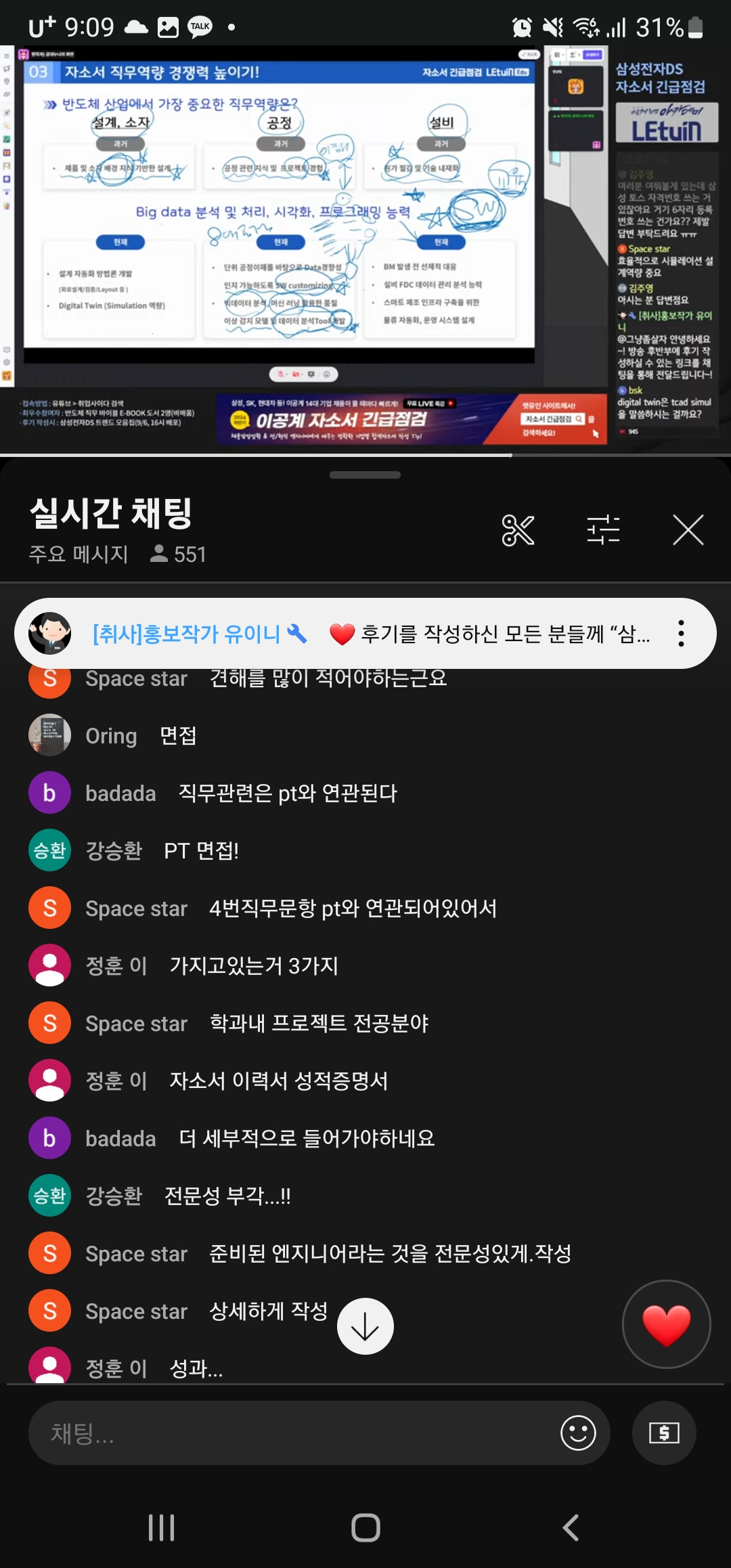 삼성전자의 현재의 트랜드, 주요 소식, 직무역량, 자소서 항목 팁, 직무의 과거역량과 현재의 역량 정리를 해주셨습니다.또한 Q&A를 통해 지원자 수강생들의 궁금중을 해소시켜주는 시간도 갖게 되어 도움이 되었습니다.