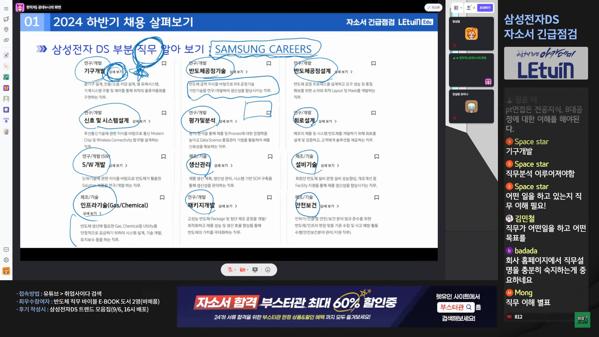 2. 자소서 작성 전 필수! 삼성전자 DS 핫 이슈 3. 자소서 직무역 경쟁력 높이 4. 삼성전자 DS 항목별 자소서 작성전략 그 밖에도 qna 진행 및 기타 꿀팁들을 알려주셨습니다. 3. 수강후기