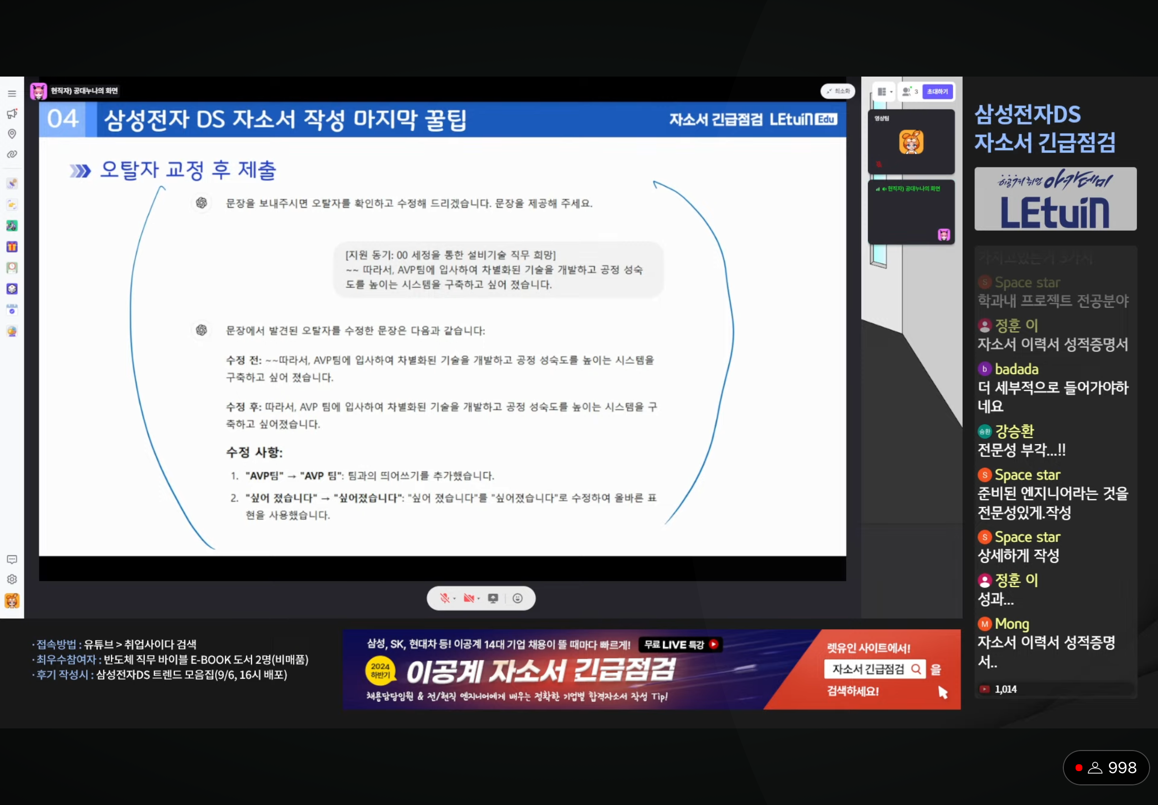 여러 기업을 준비하다보니 시간적으로 알아보기가 어려웠는데 요즘 트렌드부터 해서 직무 분석, 필요한 내용등을 1시간안에 알려주어 시간을 단축 할 수 있었고 남은 기간에 부족한 부분을 채워 AI자소서 첨삭 기회도 활용하여 서류 합격을 위해 노력해봐야겠다.