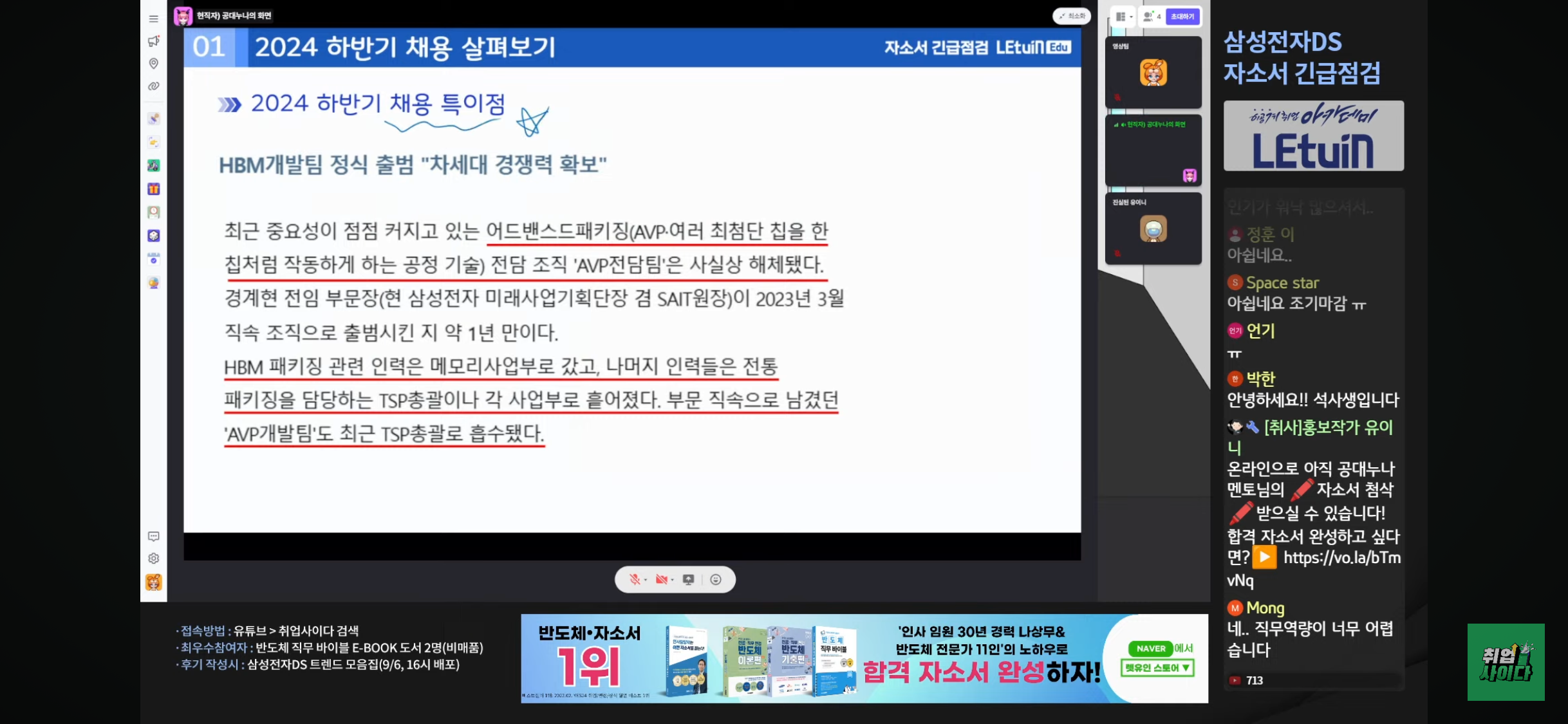 2024 하반기 채용 특이점, 최근 기업 이슈, 직무역량/직무분석의 중요성, 항목별 자소서 작성전략 및 관련 팁들에 대해 현직자의 관점에서 자세하게 알려주셨습니다. 특히 자소서 각 항목의 좋은 예와 나쁜 예시를 제시해주셨습니다.
