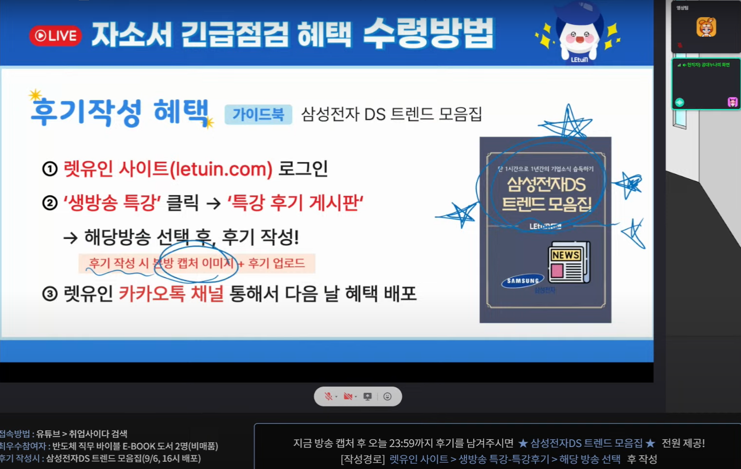 현재 반도체 산업에서 가장 중요한 직무역량은 빅데이터 분석 및 처리, 프로그램능력이라는 것을 잘 인지하게 되었습니다. 삼성전자의 최근 이슈들과 항목별 자소서 작성 전략이 도움이 많이 되었습니다. 생방송 시청 인증 이미지