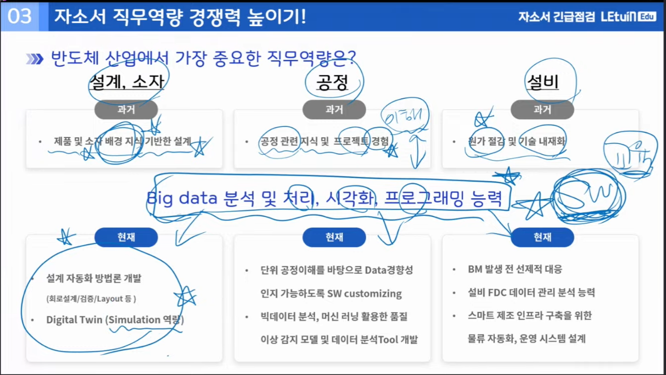 - 자소서 작성 전 필수 이슈 1.AI를 이해해야하는 이유 2. HBM및 기술 주도권 변동 3.ESG 경영 - 자소서 직무 역량 경쟁력 높이기 직무 분석 의 중요성, 주요 키워드 - 자소서 항목별 작성 전략 등 삼성전자 DS 부문 지원과 관련된 이슈, 정보에 대해 설명들을 수 있었습니다. 3. 수강후기