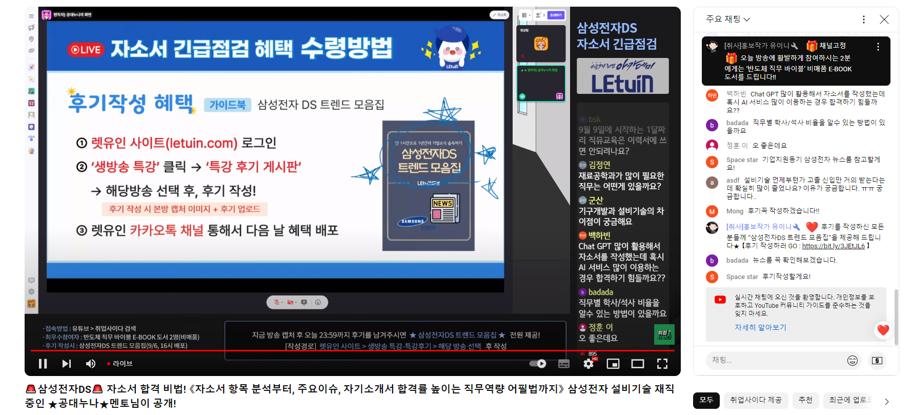 특히 자소서 내용 부분에서 알지 못했던 1번 문항을 지원한 이유에서도 여러 가지를 작성해야한다는 것이 가장 큰 깨달음 이였습니다. 그리고 3번 문항 최근 이유에 대해서도 생각은 하고있었지만 거기에 첨부할 수 있는 내용들을 얻을 수 있는 기회였습니다. 생방송 시청 인증 이미지