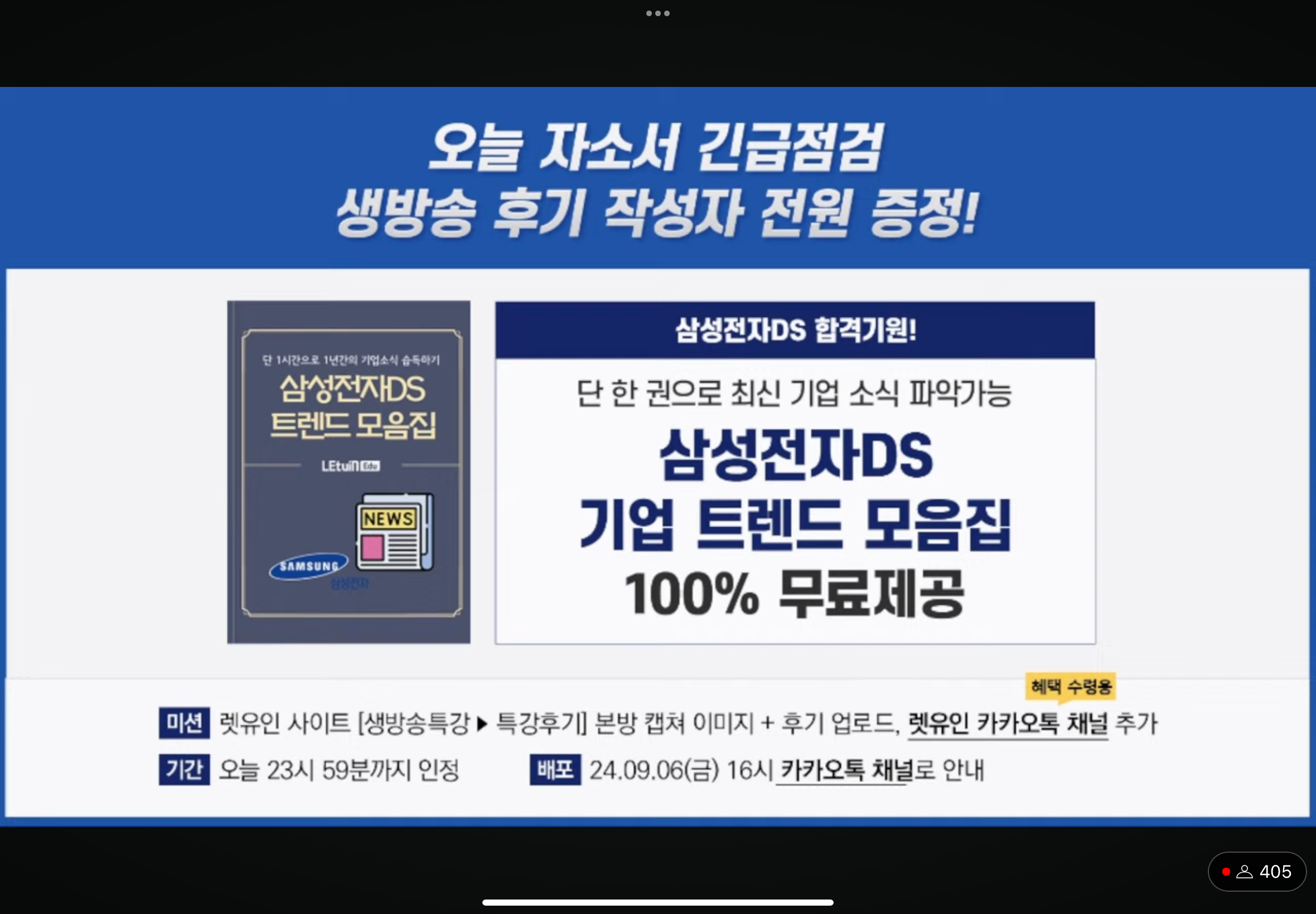 삼성전자 자소서 항목별 작성 요령, 최근 사회 이슈(ESG, AI) 등 자소서 작성에 있어서 전반적으로 가이드를 받을 수 있는 내용들이었습니다. 또한 Chat gpt 활용 해서 오탈자 수정과 첨삭을 받은 후 제출하는 것을 추천 받았습니다.