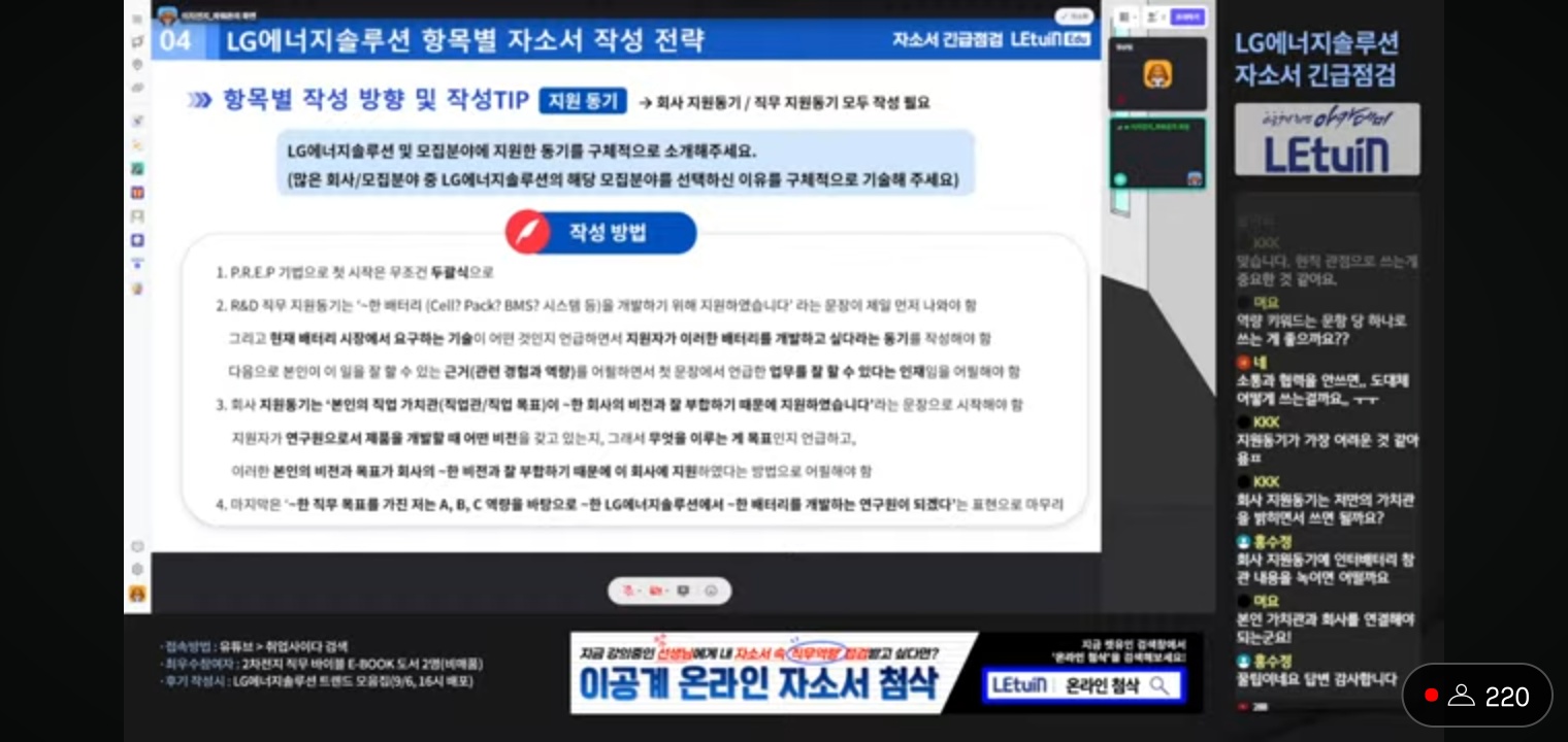 LG에너지 솔루션의 채용 분야와 배터리 시장의 트랜드, 현직에서 사용하는 용어를 자세하게 설명해주셨습니다. 그리고 문항에 대한 자기소개서의 예시를 전체 보여주셔서 어떠한 방향으로 작성해야 하는지 설명해주셨습니다.