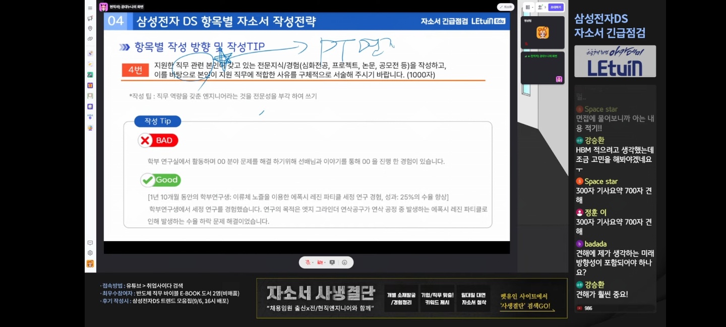 먼저 자소서 항목 1번을 "왜 반도체? 왜 이 사업부? 왜 삼성전자? 왜 이 직무?" 이렇게 4가지 질문의 답을 하며 작성하는 것이 좋다는 것을 배울 수 있었습니다. 3. 수강후기