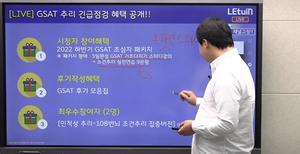 [수강 후기] 조건추리 관련하여 공부 방향성을 잡게 되었습니다. 특히 도식화 예시 및 적용 방법을 직접 같이 볼 수 있어서 좋았고 시간 속에서 풀어보니 간이 모의고사를 보는 듯한 느낌도 들었습니다. 오늘 배운 점을 토대로 GSAT를 준비하여 꼭 합격하고 싶습니다! ※ 본 게시글은 2022.09.22 진행된 주영훈 선생님의 2022년 하반기 대비 GSAT 추리 얼리버드 긴급점검 특강에 대하여 렛유인 카페에 남겨주신 생방송 특강 시청 후기입니다.