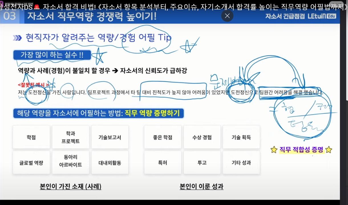 직무 역량과 자소서 사례가 맞아야 한다는 것이 인상깊었고 도움이 되었습니다. 얼른 자기소개서 고치러 가야겠네요...ㅎㅎ 강의 시간을 조금만 더 늘려서 직무별로 더 자세한 자기소개서 작성법을 배우고 싶습니다 ㅎㅎ