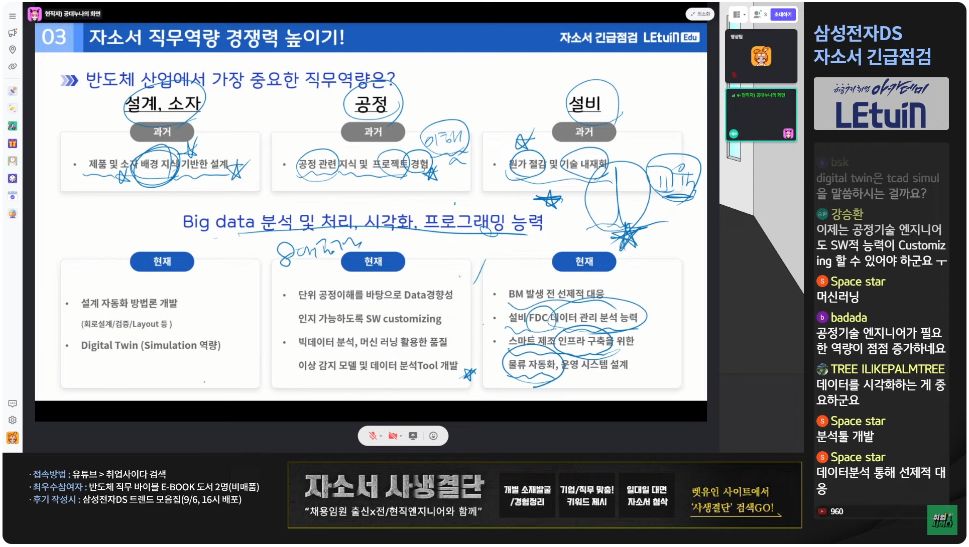 2024 하반기 삼성전자DS의 채용 직무에 대해 전반적으로 알아보았고, 최근 삼성전자(반도체 산업군)의 동향과 이에 따른 특이점 등에 대해서도 다뤄주셨습니다. 자기소개서 작성 부분에서는 문항별 작성 팁 및 고려해야 할 요소 등을 좋은 예시를 통해 설명해 주셨습니다.