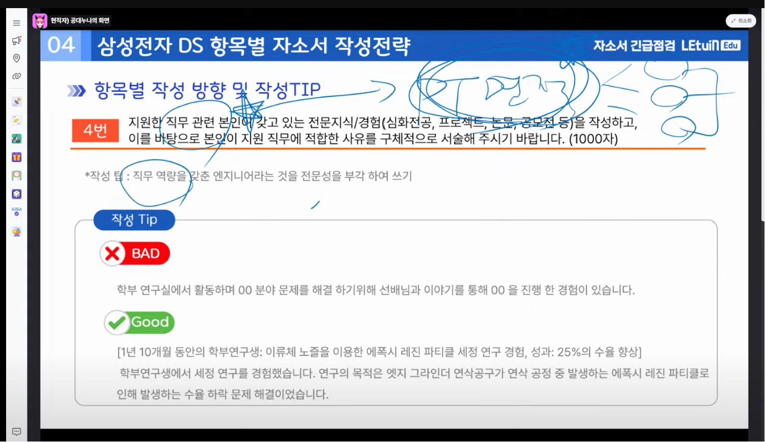 2024 하반기에 새로 바뀐 JD에 대한 설명, 기업 이슈, 직무 분석 및 직무 역량에 관한 설명, 항목별 자소서 작성 전략 등에 대한 설명이 이루어졌으며 실제로 도움을 얻을 수 있었습니다.