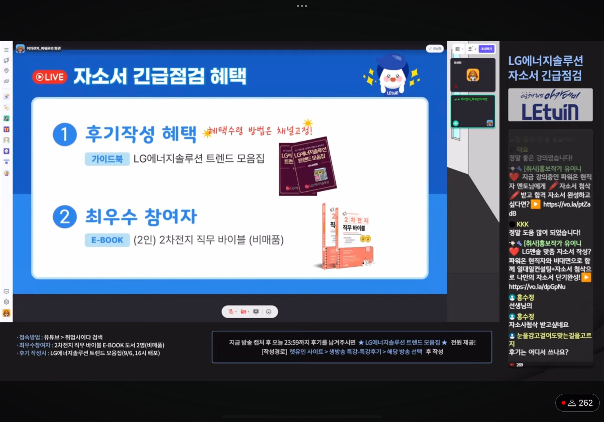 오늘 라이브 특강으로 lg에너지솔루션의 현직자 자소서 긴급점검을 들었습니다. 먼저 채용 직무를 함께 살펴보면서 학사가 지원할 수 있는 직무를 점검하기도 했습니다. 그 이후 엘지 에너지솔루션의 핫이슈를 짚어보았고 다양한 현업 용어를 통해 경쟁력을 올릴 기회를 노릴 수도 있었습니다.