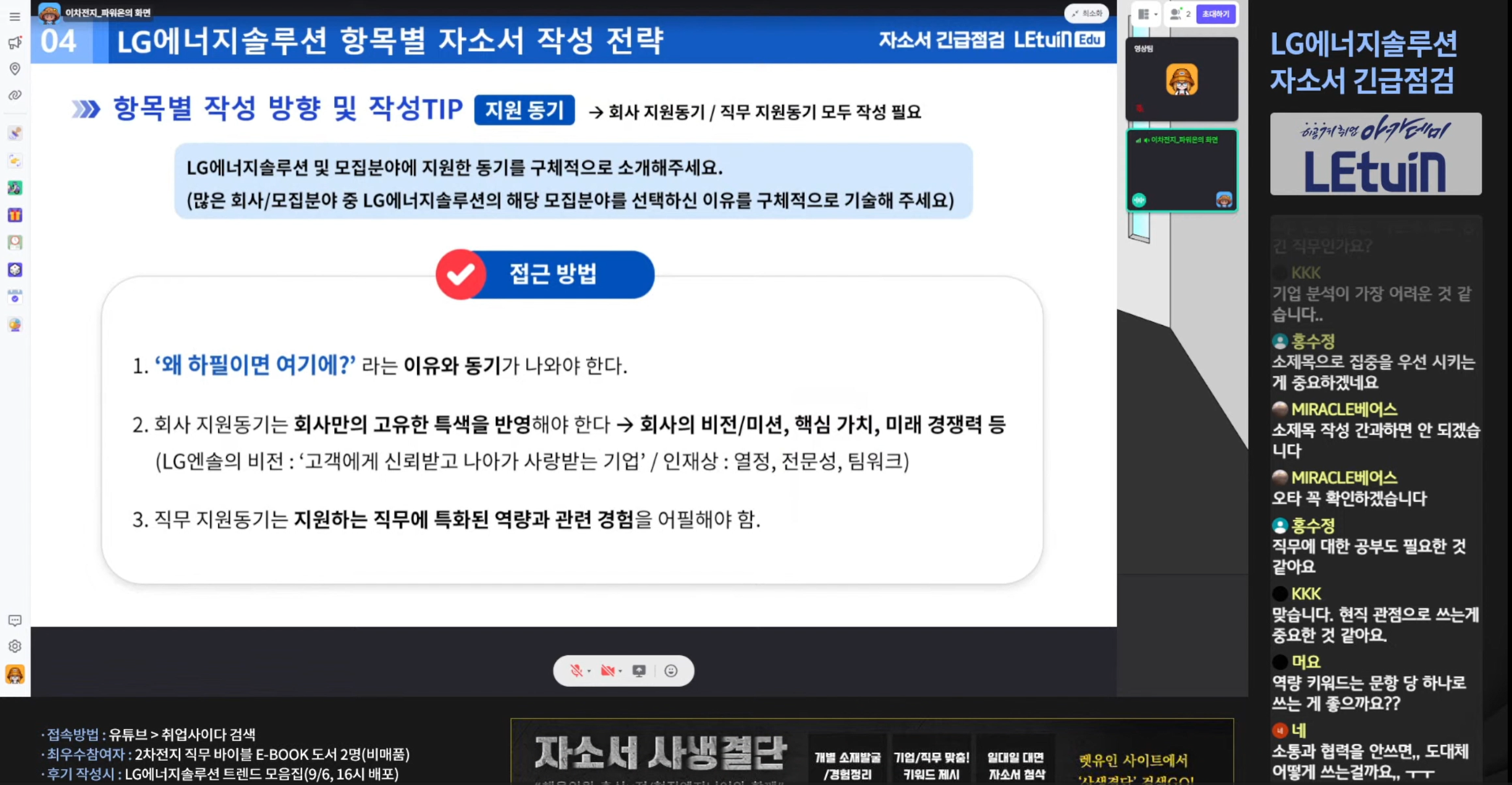 에너지 솔루션 채용공고에 올라온 직무 이해를 어떻게 하면 잘 할수 있는지 알려주셨습니다. 자소서 항목별로 무엇을 어떻게 작성해야 하는지 무엇을 쓰면안되는지 예시 들어주시면서 알려주셨습니다 .