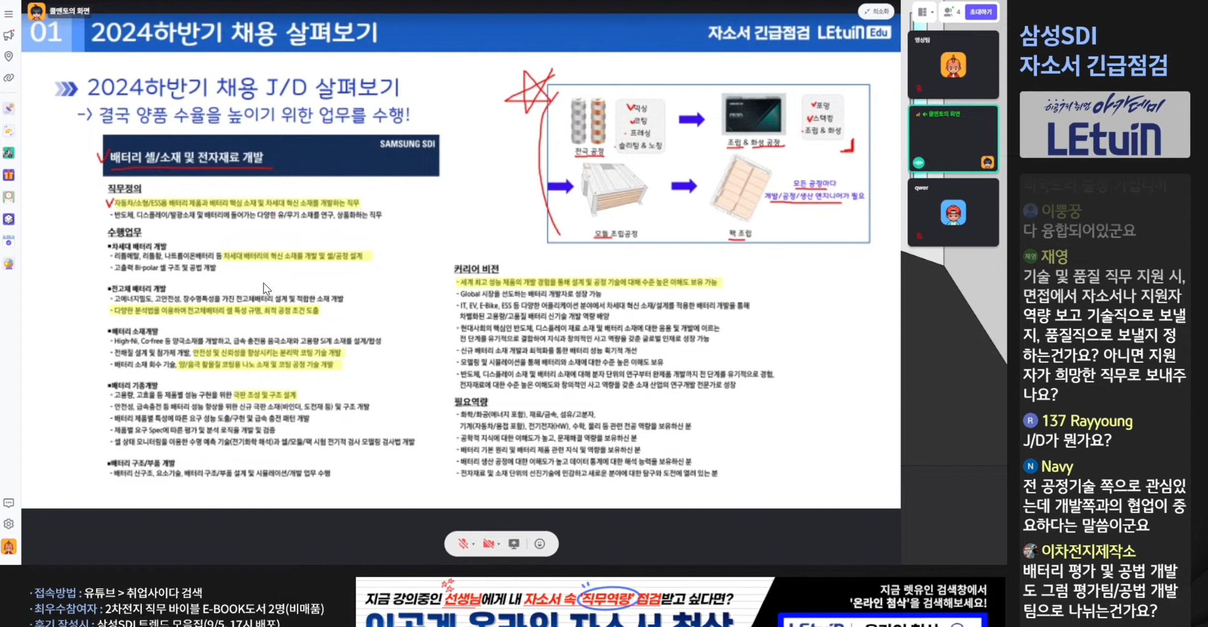 삼성sdi 채용공고에 올라온 직무 이해를 어떻게 하면 잘 할수 있는지 알려주셨습니다. 자소서 항목별로 무엇을 어떻게 작성해야 하는지 알려주셨습니다. 현재 이슈들에 대해서 알려주셨습니다.