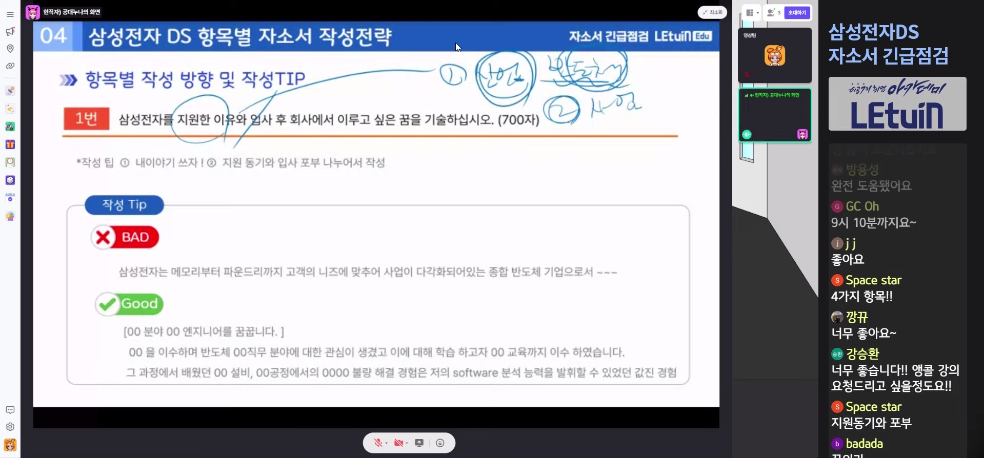 공대누나 멘토님이 현재 삼성전자의 상황, 산업 분석부터 현업 용어까지 자세히 알려주셔서 좋았습니다. 다음 번은 없었으면 좋겠지만 만약 내년 상반기에도 취업 준비를 하게 된다면 다시 듣고 싶습니다.