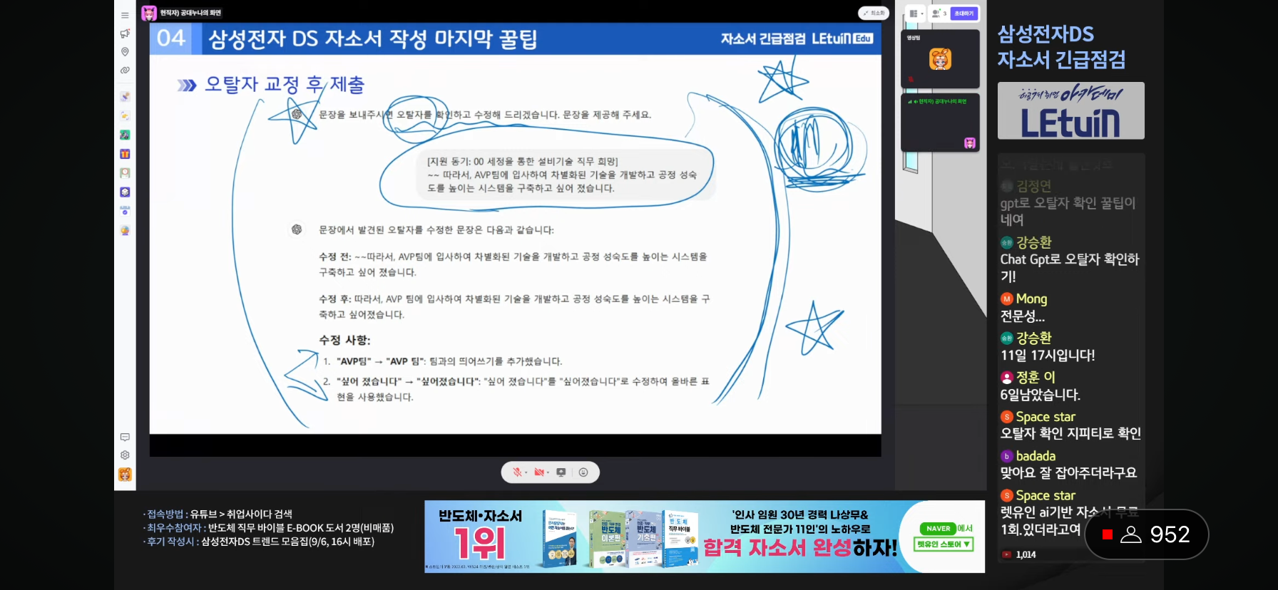 삼성전자 최신 트렌드 3번문항 -> AI, ESG, HBM 등 하반기 채용 특이점 하반기 채용 직무별 숙지해야할 키워드 직무 선택방법 및 유의할 점 올해 조직변동 사항 등에 대해 알 수 있어서 좋았습니다 생방송 시청 인증 이미지