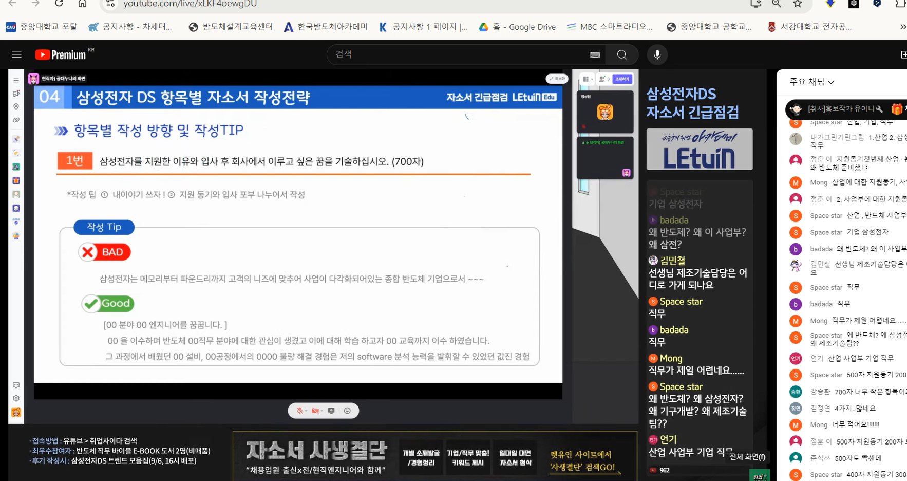 삼성전자 채용 공고가 어제 올라온 후, 약 1주일 가량의 조급한 시간이 있어 막막했는데, 긴급 점검 자소서 특강 덕분에 방향성은 어느정도 잡은 것 같아 정말 유익한 특강 이었습니다. 열심히 준비하여 서류 합격을 향해 노력할 것입니다.