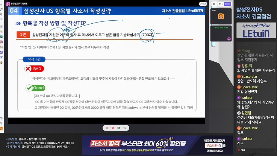 삼성 DS자소서의 항목별 작성 요령과 방법을 알려주셨습니다.