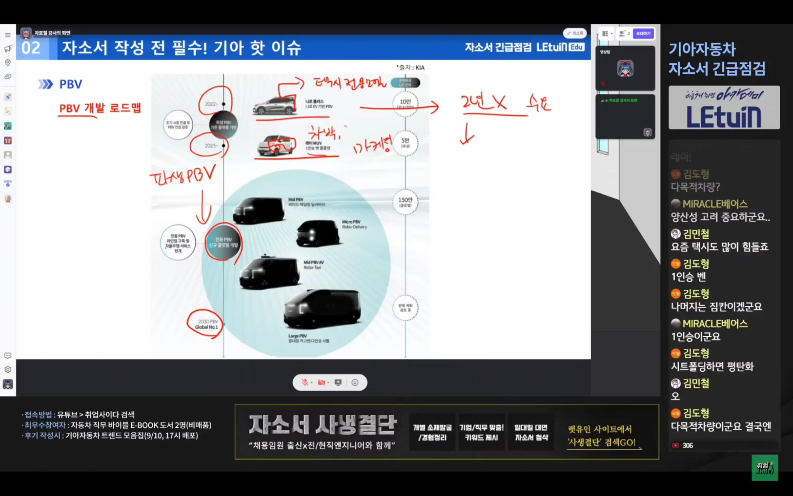 기업 분석 및 기업에서 추구하는 인재상, 자기소개서 문항 분석과 해당 문항에 어떤 내용이 들어가면 좋을지, 어느 방향으로 작성할지 강의했습니다. 또한 최근 사업 이슈인 PBV 차량에 대해서도 설명해주셨습니다.