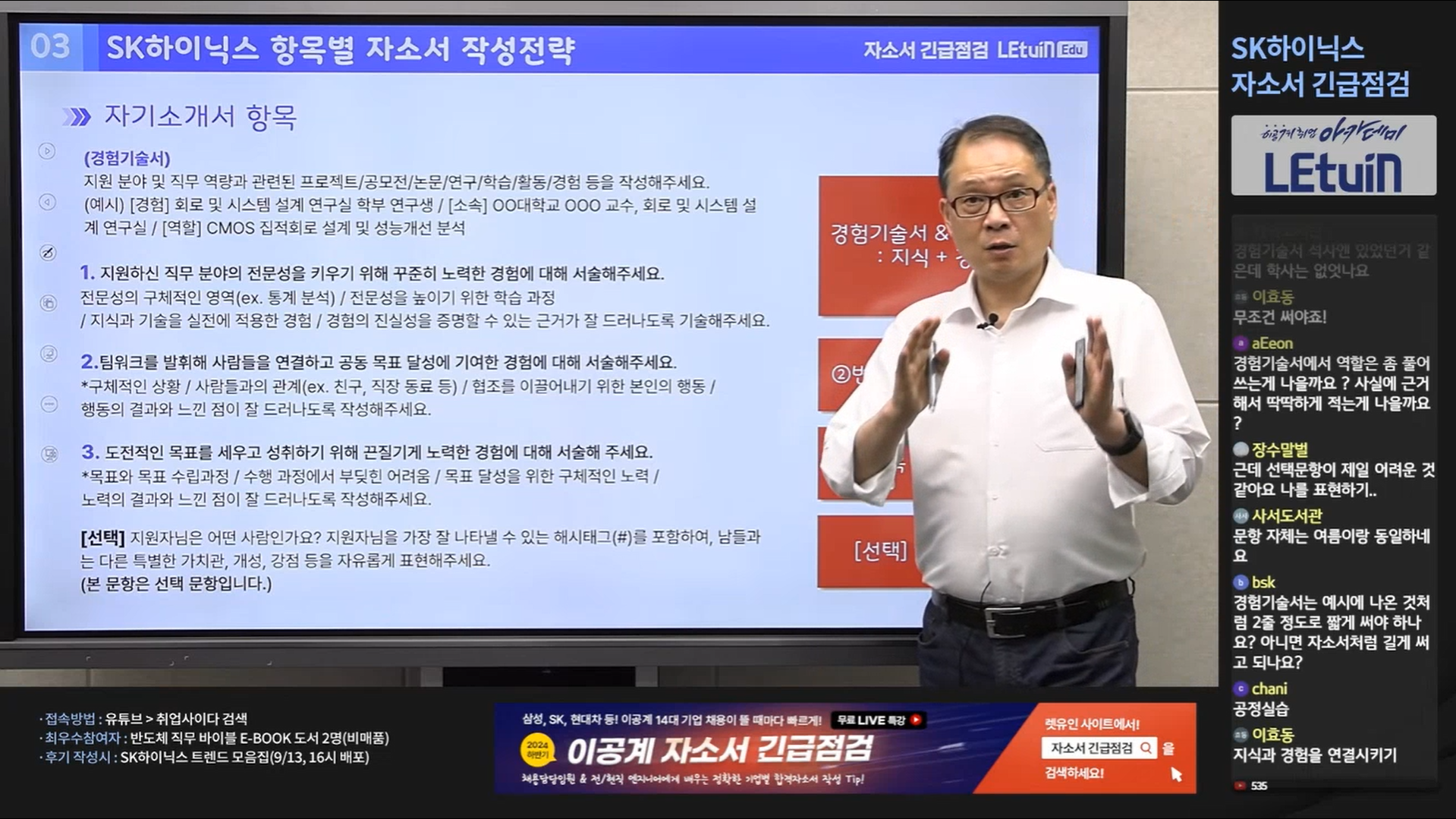 특히 자기소개서 작성법에 대한 내용이 유익했습니다. 내가 하고 싶은 말이 아니라 회사가 듣고 싶은 말을 써야 한다는 것이 기억에 남습니다. 생방송 시청 인증 이미지