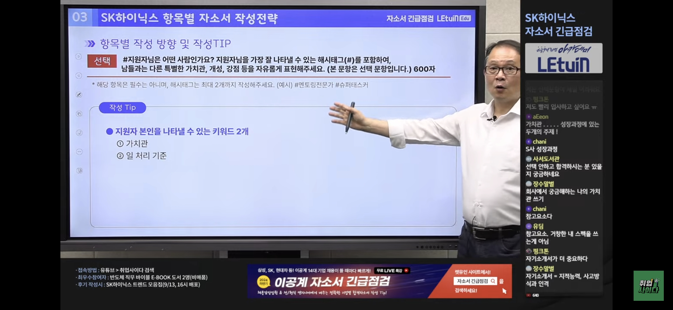 자소서를 처음 작성하는 사람, 자소서에서 항상 탈락하는 사람, 자소서 작성에 팁을 배우고 싶은 사람에게 추천하는 강의입니다. 라이브가 길지도 않고 설명도 간결해서 좋습니다.
