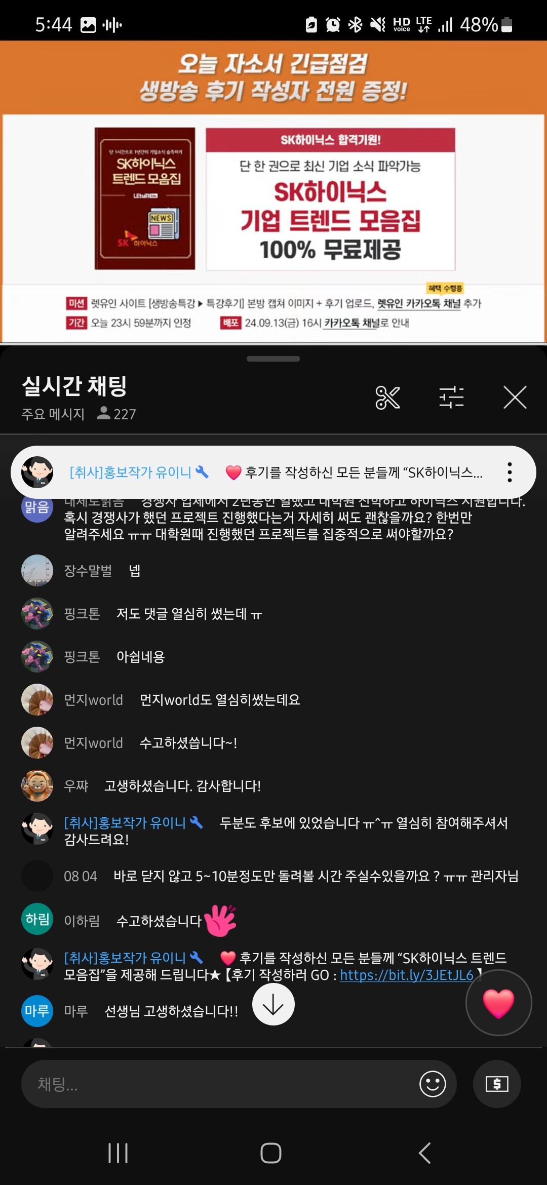 인사담당자의 입장에서 간결한 것을 좋아한다는 것을 매우 강조하셨습니다. 그 부분을 잠시 잊고있었는데 다시 한번 상기시킬 수 있었습니다. 실제로 내가 말하고 싶은 자소서보다는 읽고싶은 자소서를 만드는 것이 중요하다고 생각했습니다. 하이닉스의 가치관을 잘 고려해서 자소서를 더 명확하게 수정해야겠다고 생각했습니다.