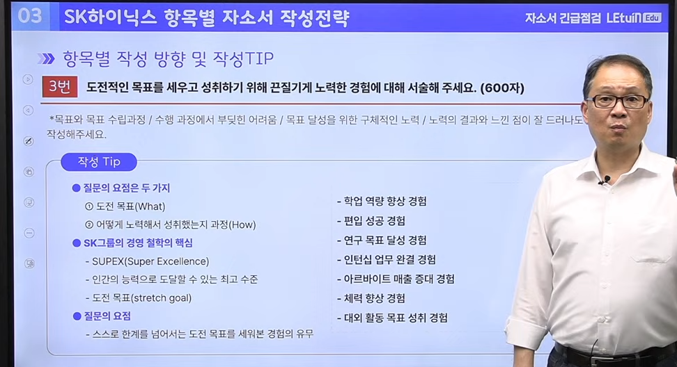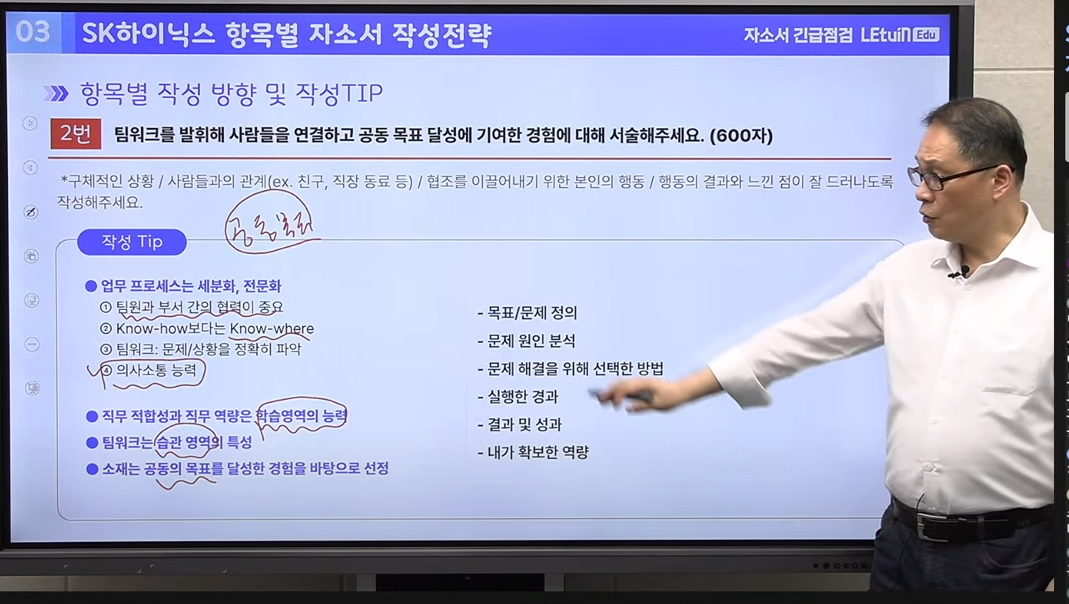 sk 하이닉스 지원을 위한 자소서를 작성하기 위해서 어떤 방향으로 경험을 풀어나가야 할지 도움이 되는 팁을 많이 제공해 주셨으며, 취업 성공을 위해 어떤 부분에서 노력해야 하는지 설명해 주셧음.
