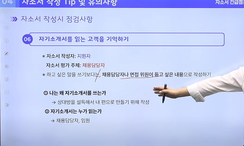합격 사례와 함께 각 항목 작성을 어떤 방향으로 해야할 지 잘 설명해 주셧습니다. 또한 자소서를 쓸 때 어떤 목적으로 작성해야 할지, 자소서 작성을 위한 200자 원고지 방법과 같은 실용적인 팁도 여럿 설명해 주셨습니다 . 또한 지원할 때 스펙으로 과하게 걱정할 수 없다는 것과 같은 조언도 같이 해주셨습니다.