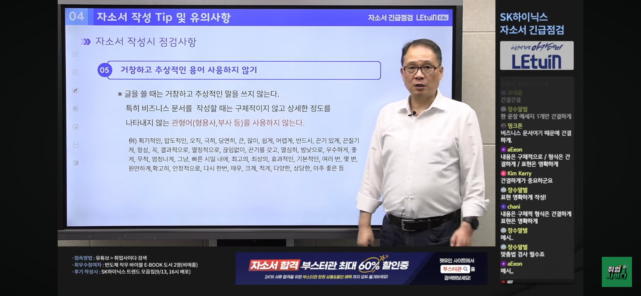 지난 채용과 다른 점 정리해주셨고 자소서 항목별로 어떻게 작성해야하는지 구체적으로 설명해주셨음. 또한 인사담당자의 입장에서 생각할 수 있도록 알려주셨습니다. 또한 마지막에 자소서 ㅂ작성 시 주의해야할 부분들도 짚어주셨습니다