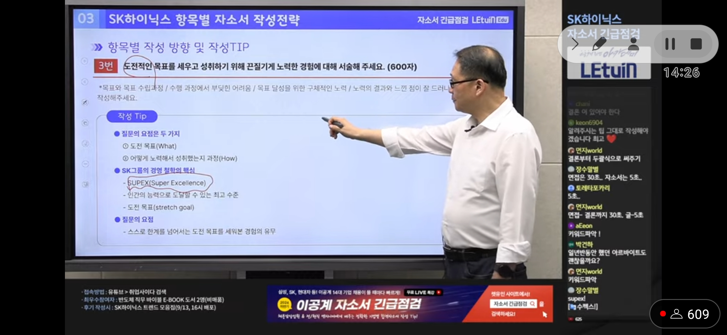 하이닉스 자소서 쓰기가 좀 막막하고 어려움이 많아서 계속 미루고 있었는데 세세한 가이드라인을 주셔서 자소서 작성에 큰 도움이 될 것 같습니다! 강사님과 렛유인에 감사드립니다~~~~