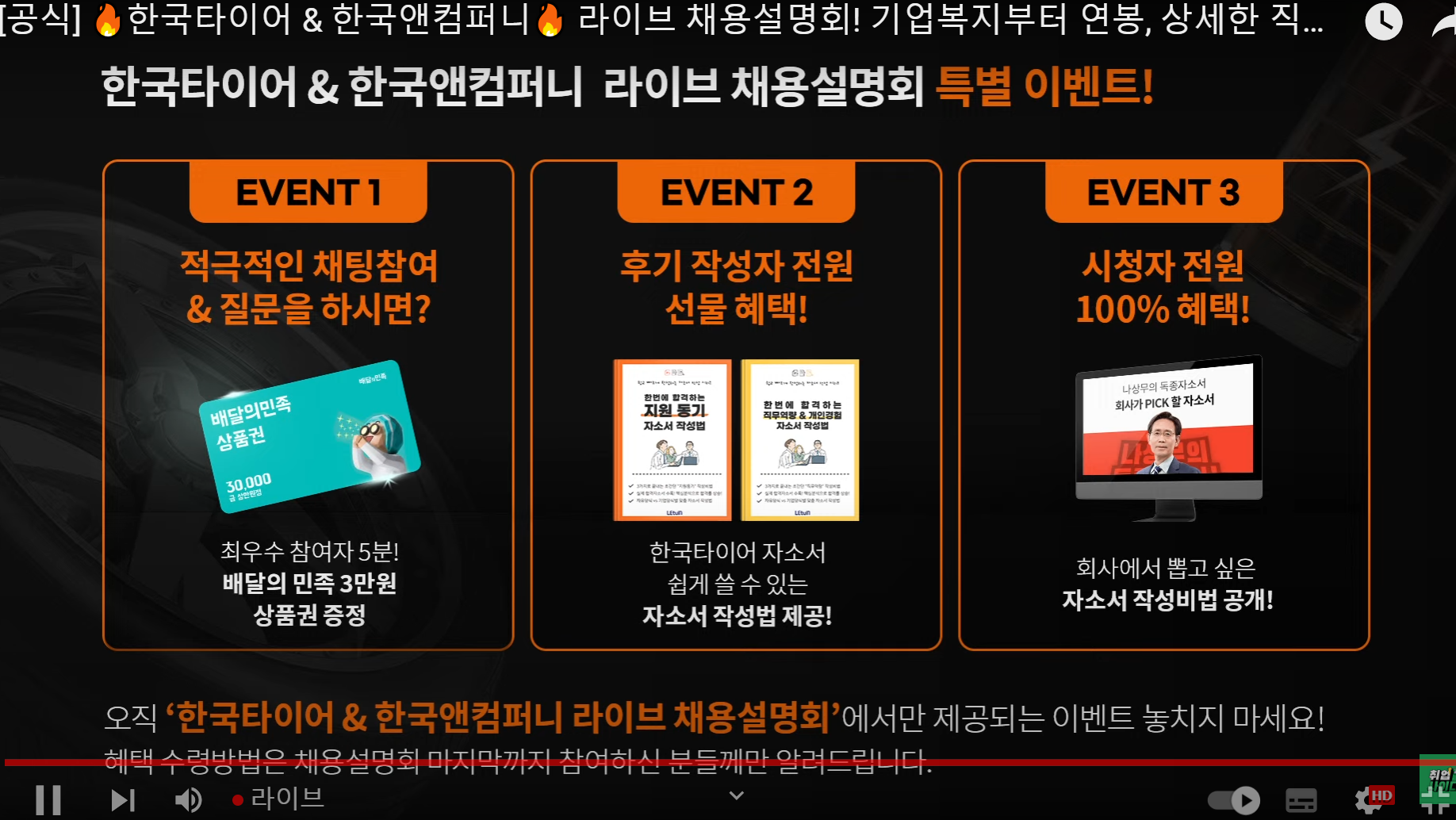 2024 한국 타이어와 한국앤컴퍼니 라이브 채용설명회로 각 직무공고에 대해 현직자님과 인사담당자님꼐서 설명해주셨습니다. 직무 하나하나 디테일하게 설명해주셔서 자소서 쓸때 도움이 정말 많이 될 것 같습니다. 감사합니다.