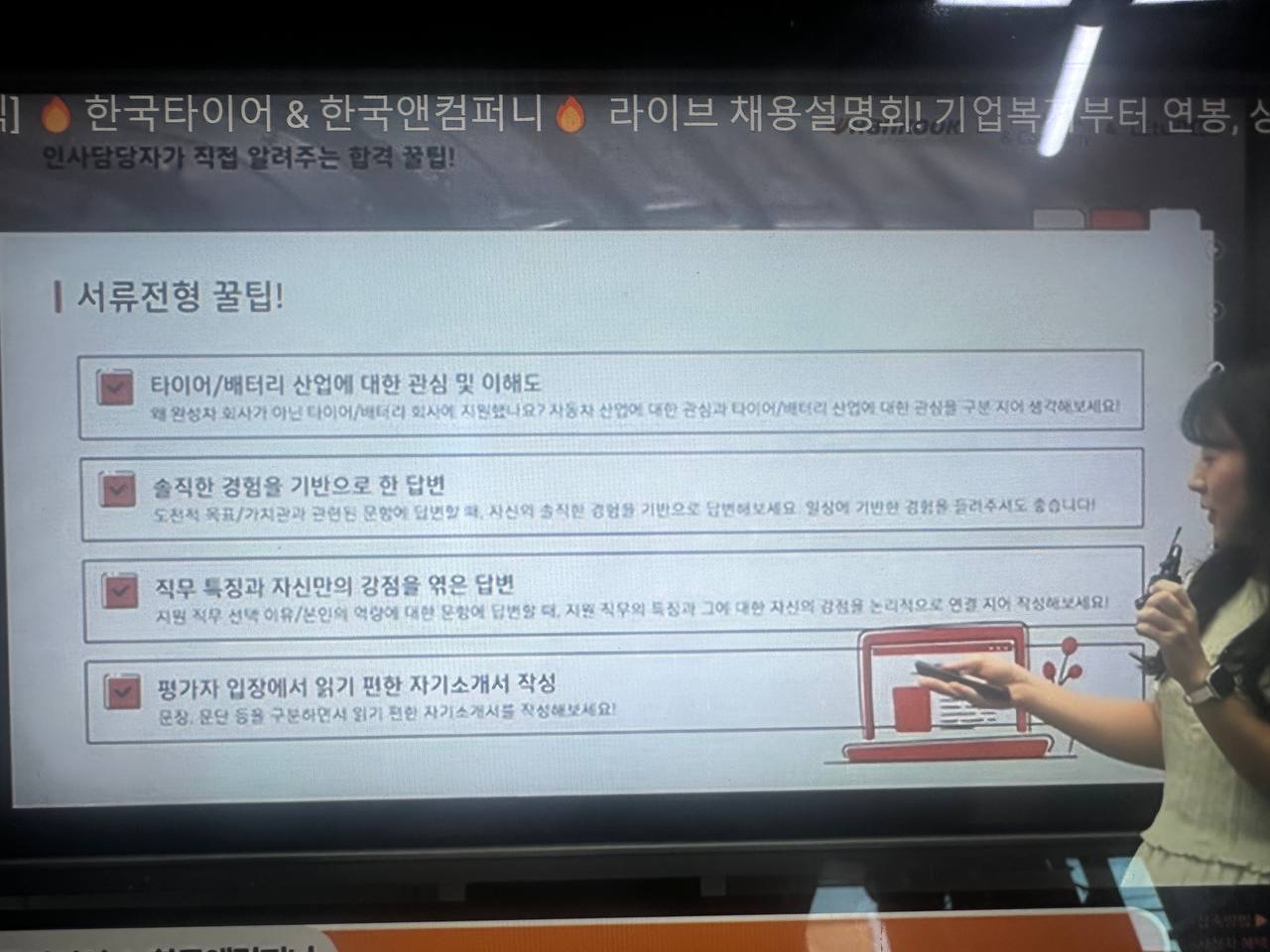 각각의 지원분야에 대한 업무에 대한 설명도 좋았고 저는 특히나 지원할 때 알아두거나 숙지해두면 좋은 점들에 대해 이야기 해 주신 것이 특히 도움이 많이 되었습니다. 특히 기본적으로 업무 세부설명에 나오는 용어는 검색하여 숙지해놓는다거나 자소서를 쓰거나 면접때 활동을 통해 뭘 얻었고 그것을 통해 얻은 역량이 회사에 어떤 도움이 될것인가 적는 것이 중요할것같다