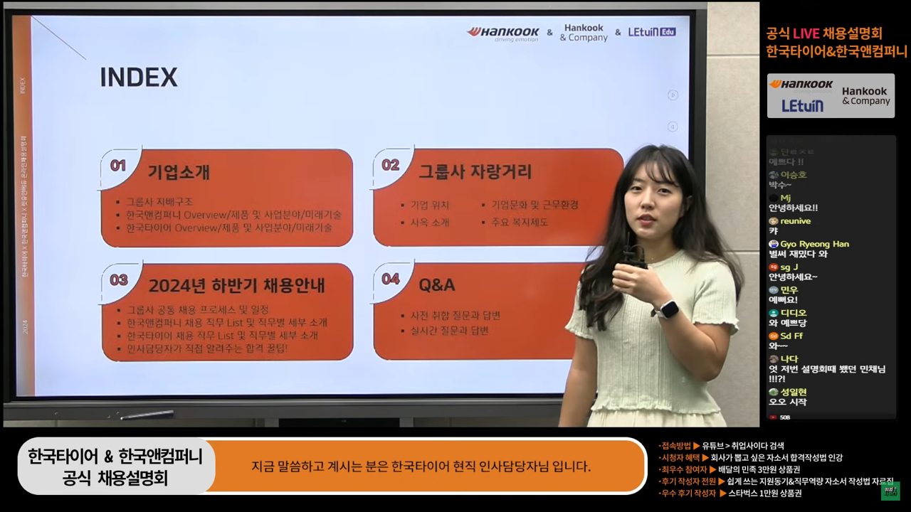 - 채용 프로세스 - 직무별 세부 소개 (+ 타이어 회사의 전반적인 프로세스) - Q&A (사전에 받은 질문 + 라이브 채용설명회에서 실시간 채팅으로 받은 질문) 3. 수강후기
