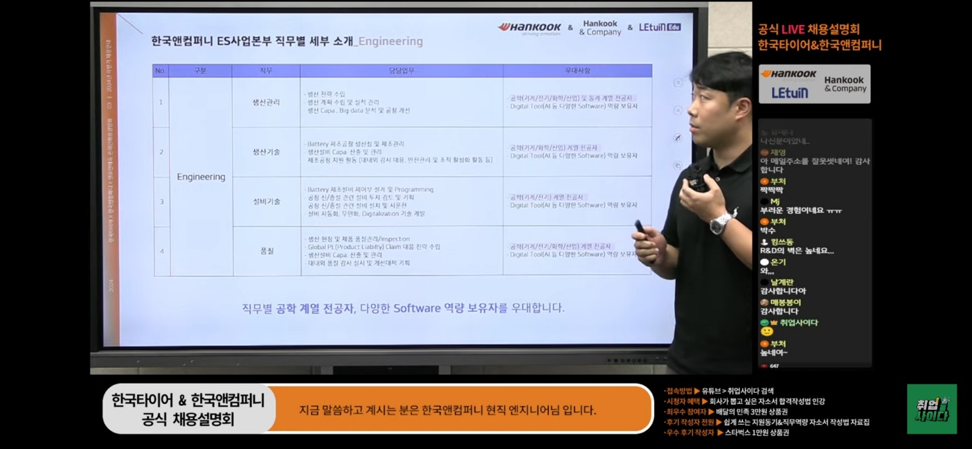 한국타이어와 한국앤컴퍼니의 직무 설명과 필요 역량 설명이 있었고, 한국앤컴퍼니는 납축전지를 주로 생산하고 있지만 LIB 연구 개발의 경우 BMS가 적용된 LIB를 개발하고 있는 점, 충전 성능 및 사이클 성능을 위한 소재나 공정 개선을 연구하는 점을 잘 설명해 주셔서 좋았습니다.