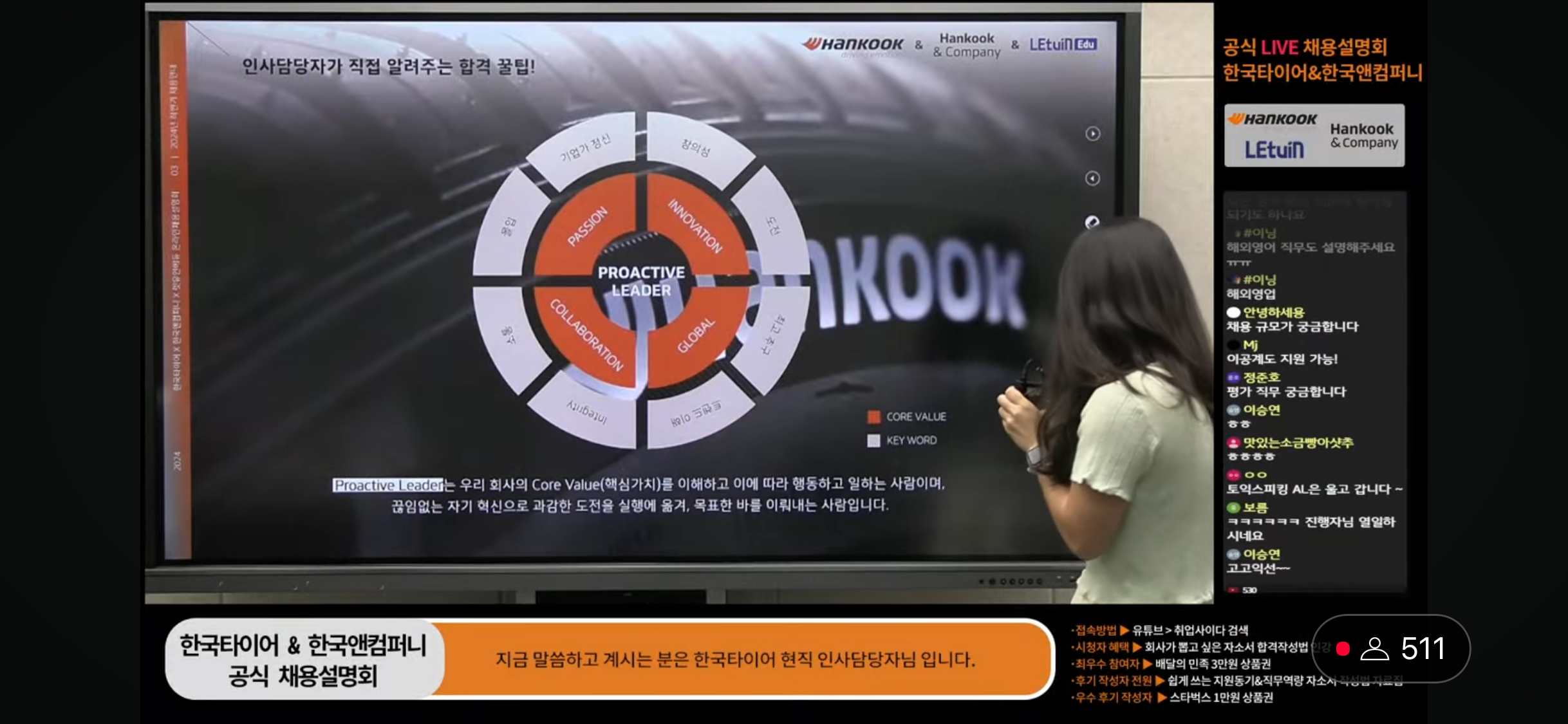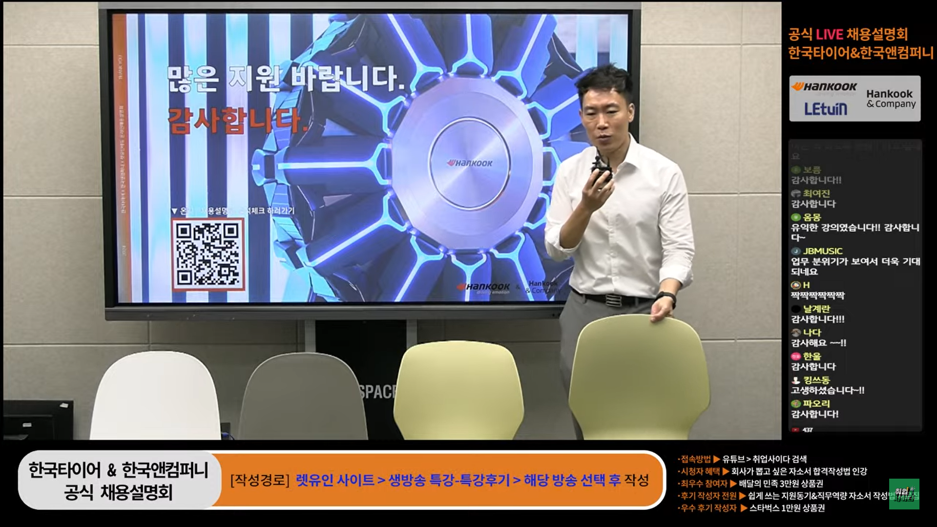 한국타이어의 R&D 직무별 실제 근무 인원과 이번에 채용하는 TO의 퍼센트에 대해 시원하게 말씀해 주셔서 좋았습니다. 자소서와 면접에 대한 팁과 자신이 경쟁력 있게 어필할 수 있는 직무에 지원하라는 조언도 좋았습니다. 특히 자소서에 작성하는 내용에 대해서 어떤 식으로 작성하면 좋을지 말씀해 주셔서 좋았습니다.