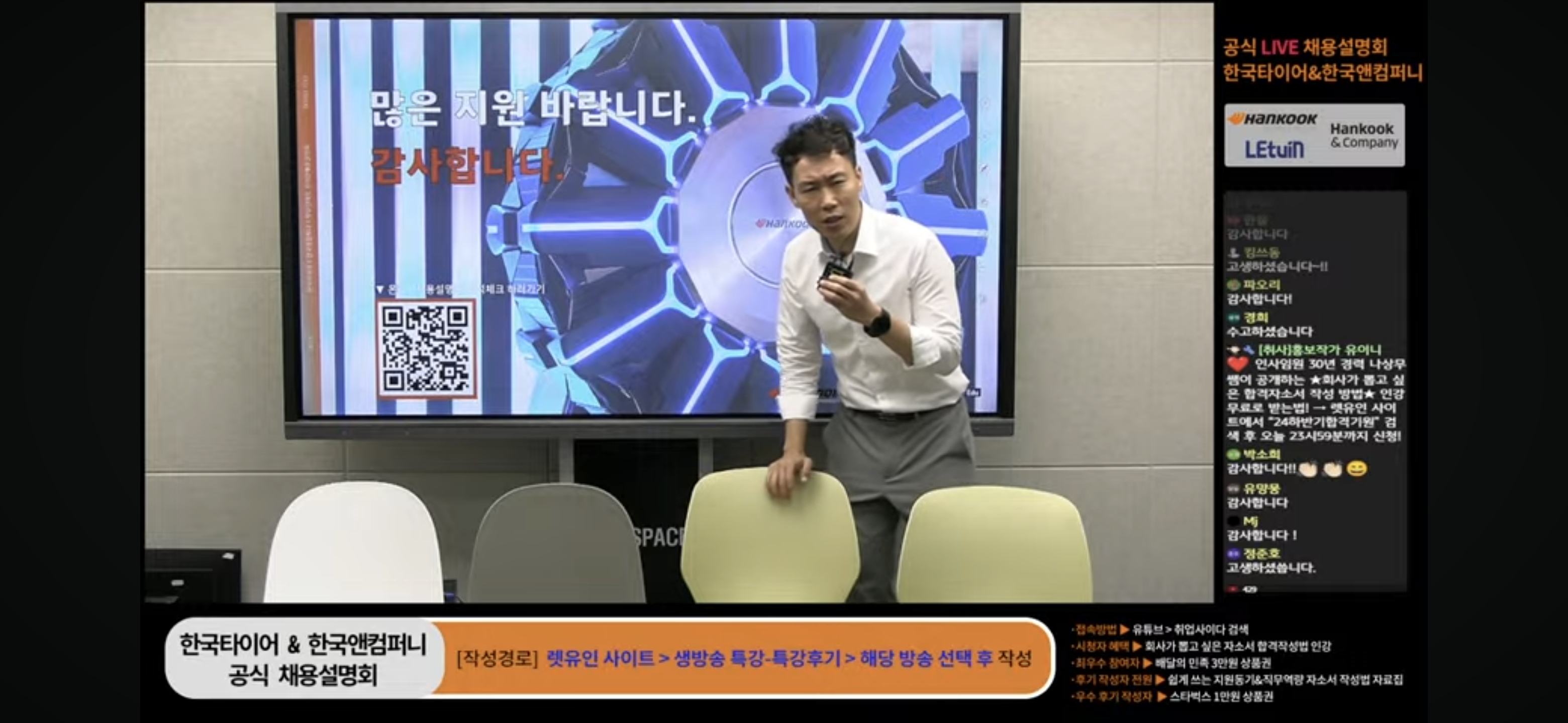 한국타이어 채용설명회 처음부터 끝까지 시청했는데 정말 많은 정보 얻어가네요 특히 이공계 직무를 자세히 알려주셔서 감사했습니다! 그리고 생산기술 직원분 정말 재밌으십니다. 꼭 입사해서 같이 일하고 싶어요ㅎㅎ