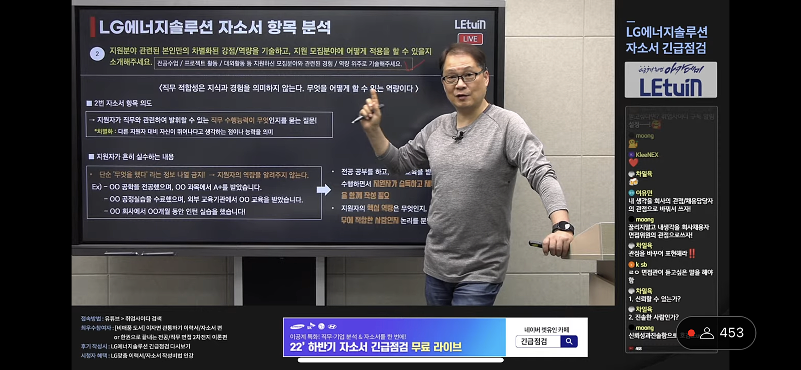 ※ 본 게시글은 2022.09.05 진행된 안재형 선생님의 2022년 하반기 대비 LG에너지솔루션 자소서 긴급점검 특강에 대하여 렛유인 카페에 남겨주신 생방송 특강 시청 후기입니다.